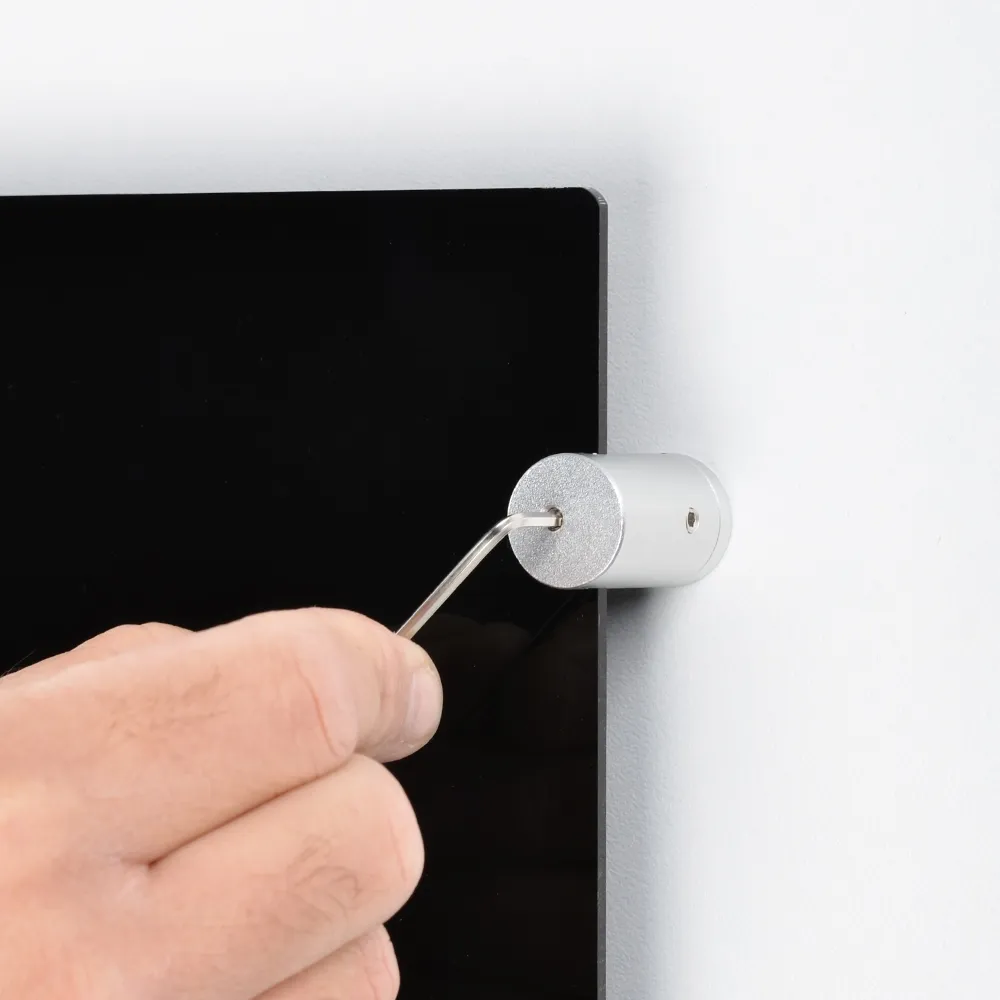 These aluminium stand offs are tightened using the included allen wrench to secure the board to the wall. Installation hardware is included with each purchase. The wall anchors and screws will allow for installation into most wall surface types, though you should check with a professional if you are unsure. The stand offs have a matte silver finish to easily fit in with any location!