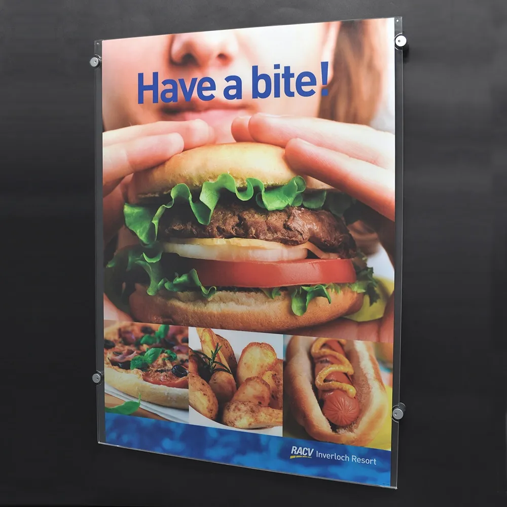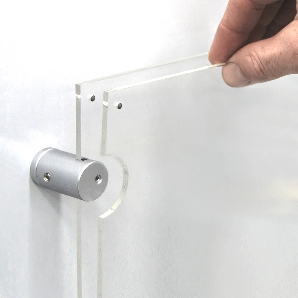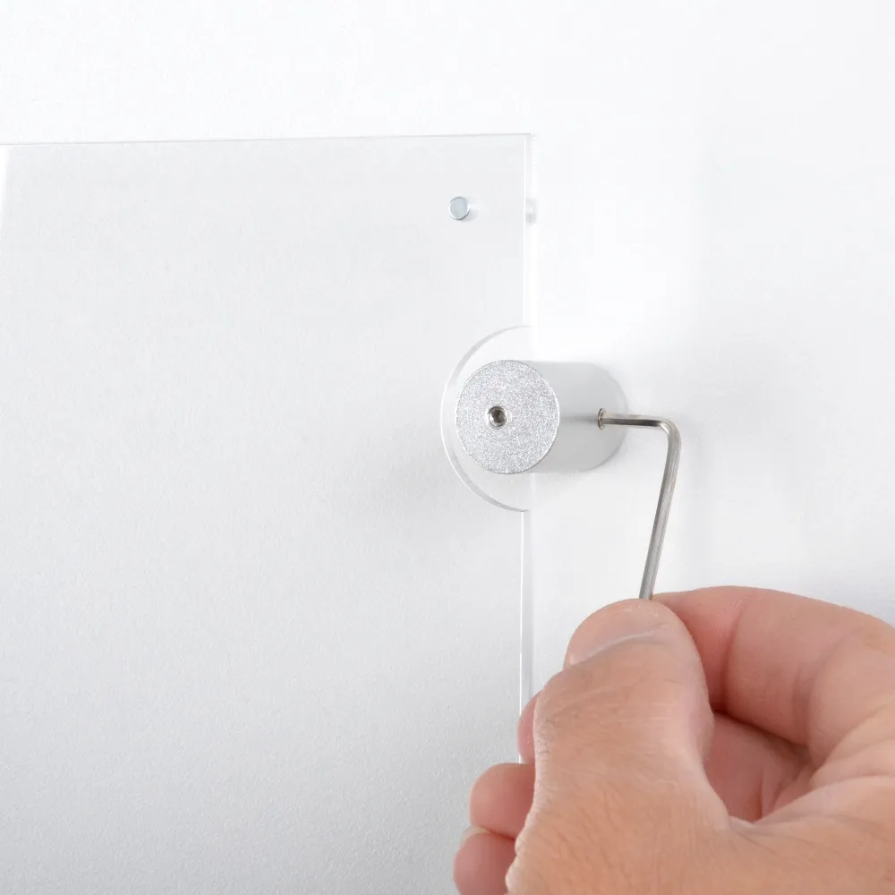 This wall signage features (4) edge-grip standoffs holding an acrylic sign holder. The wall mount sign bracket uses aluminium standoffs to provide a durable display that is great for heavily trafficked areas. This wall signage also include an allen key for securing the standoffs to the acrylic sign holder as well as the provided wall anchors. This wall mount sign bracket, wall signage has button magnets embedded in the acrylic that hold the top of the acrylic together to assist in keeping the graphic in place. To change out your poster, simply separate the top of the acrylic, switch the graphics, and allow the magnets to reattach. No tools are required when changing posters!