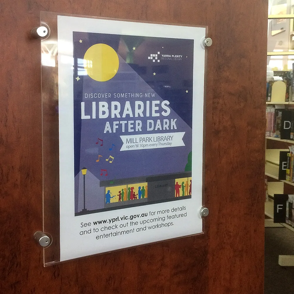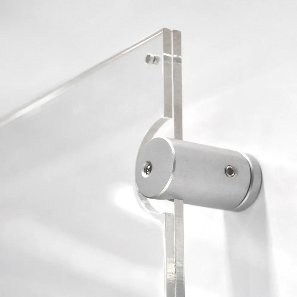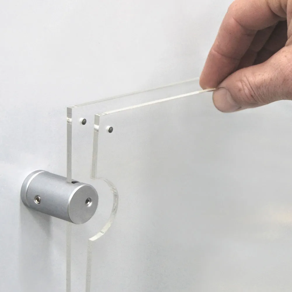 This standoff signage displays an A2 graphic in portrait orientation, making it an effective advertising tool. The sign stand off is used for promotional or informational purposes at information centres, exhibition halls, office lobbies, retail stores, and other such businesses. The sign fixing, standoff signage has (2) button magnets embedded in the acrylic to help keep the graphic in place. To switch out the graphic, pull apart the button magnets at the top of the unit, change the old graphic with the new one, and let the acrylic holder close! Graphic change-outs take under a minute with this sign stand off!