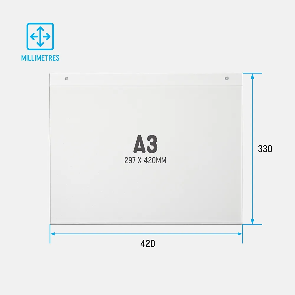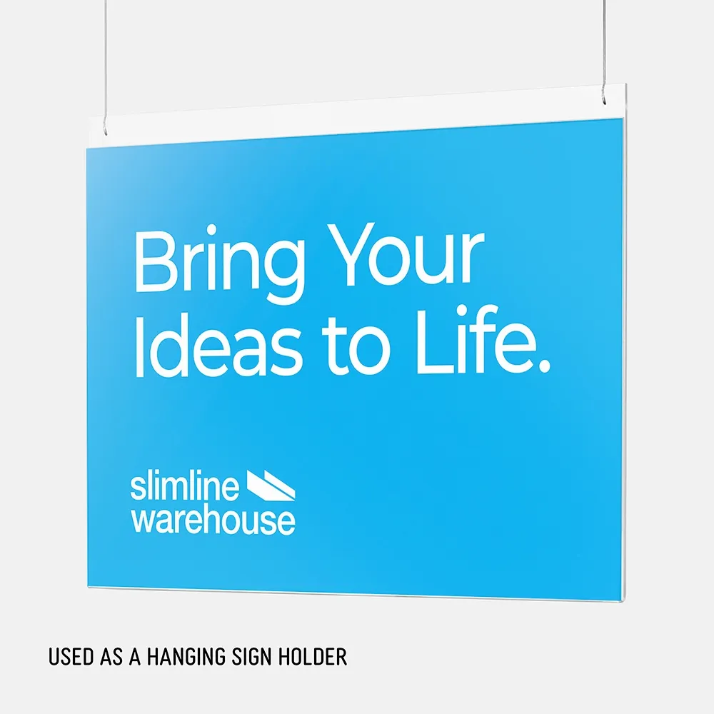 This simple display is designed to hold a single A3 sheet in landscape format (297 x 420mm). Its fabricated in clear acrylic and is designed to be fastened directly to a wall or other shop fixture on your premises. Alternatively you can hang this sign holder from the ceiling of your premises.