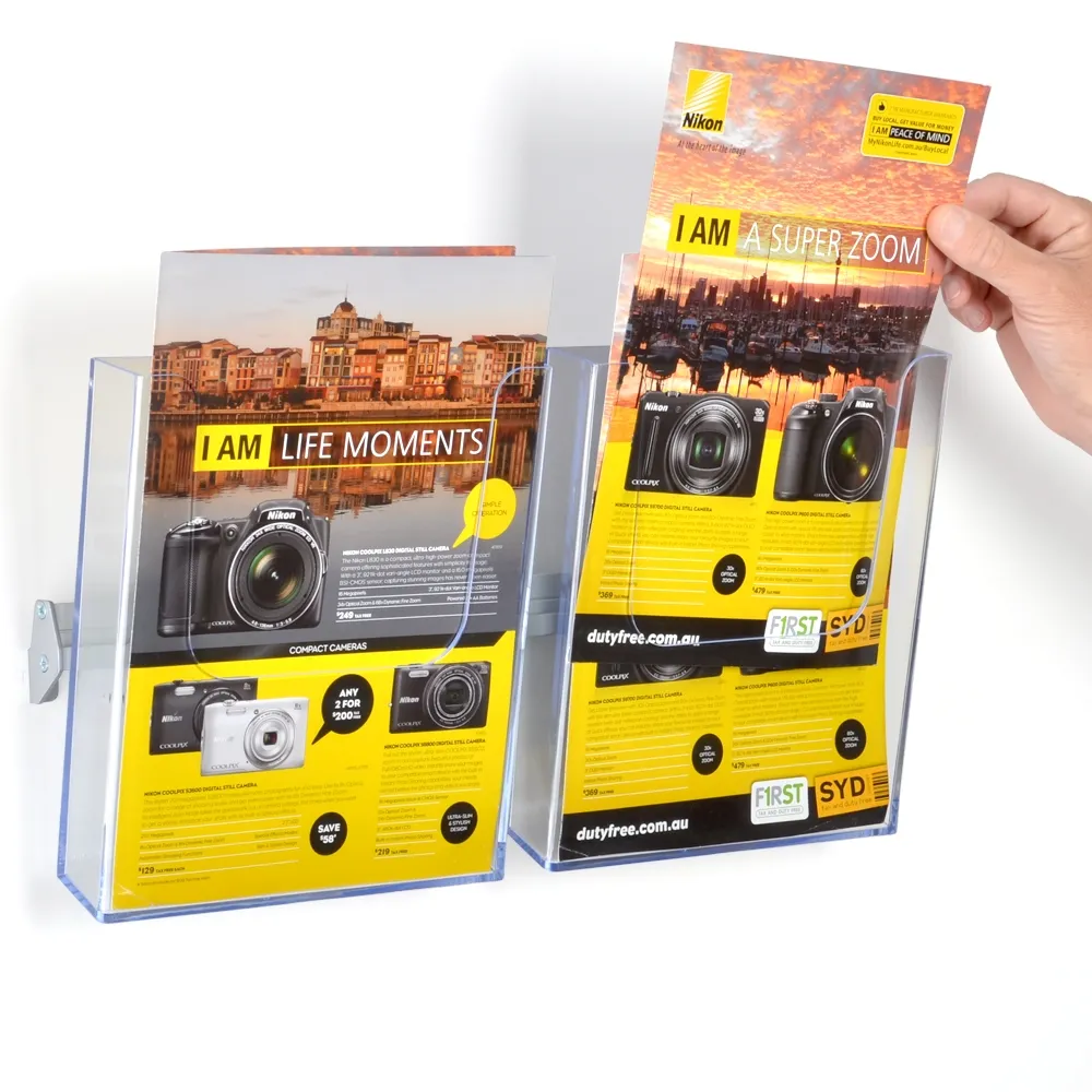 The catalogue display, magazine holder has (2) acrylic pockets that are designed to hold A4 (297 x 210mm) sized brochures, leaflets, and pamphlets. These pockets are clear so that the entire item can be seen whilst on display to help patrons see what they are taking.