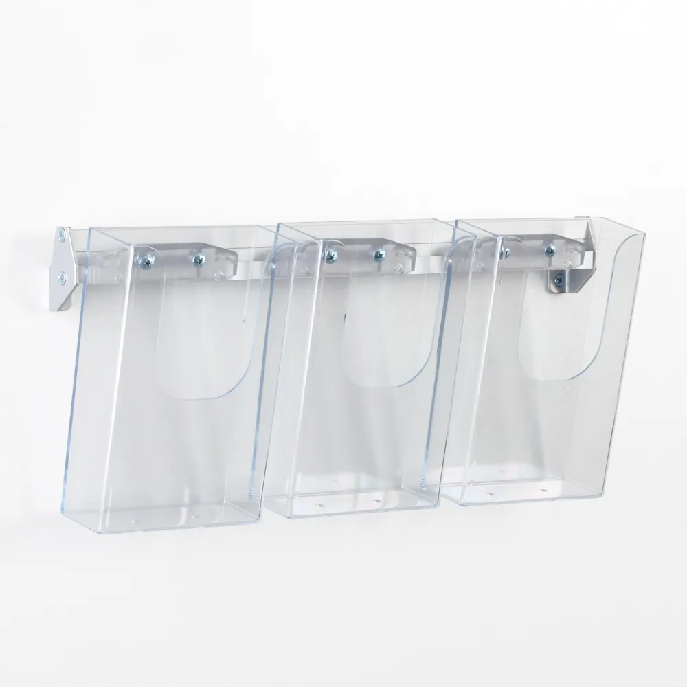 The catalogue holder, wall brochure display features (3) acrylic pockets that are angled to make it easy to read what is being displayed. These clear pockets also feature a cut-out to make it easy to quickly grab brochures and take them home to learn additional information about a company's goods and services, travel locations, and much more!