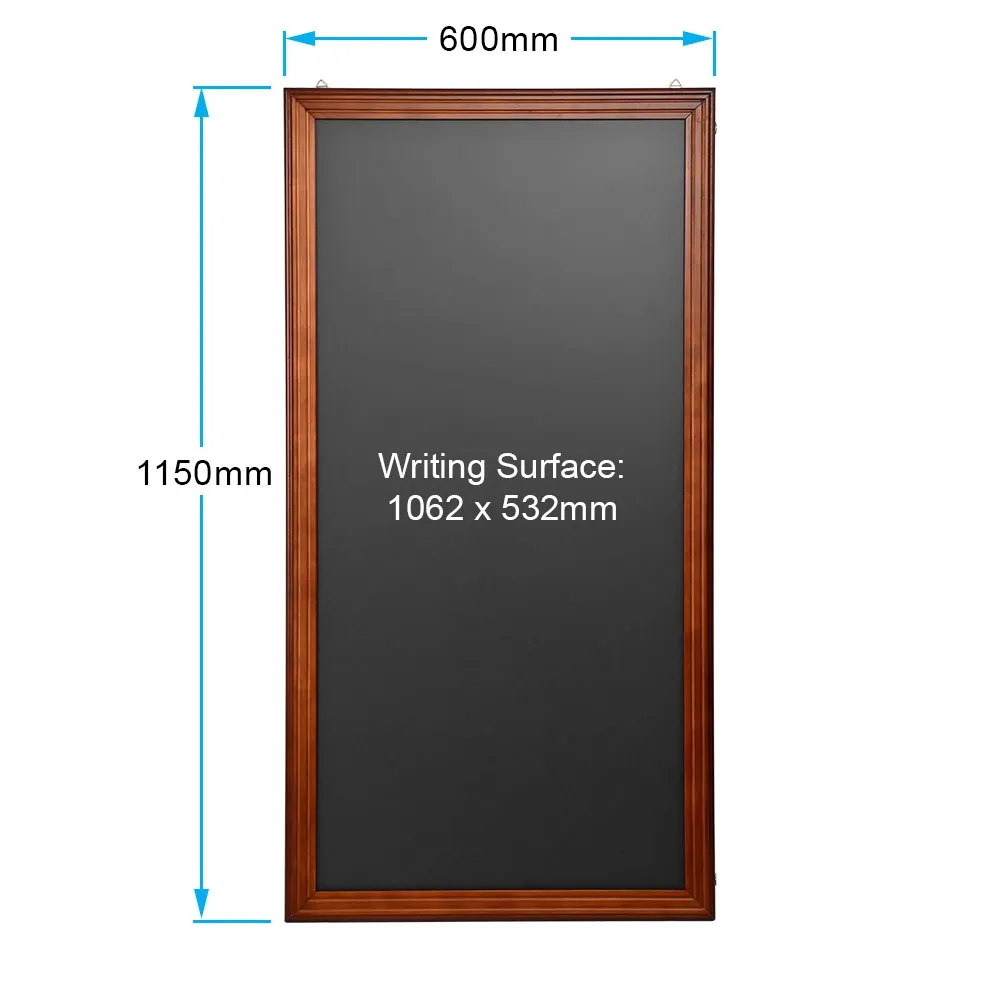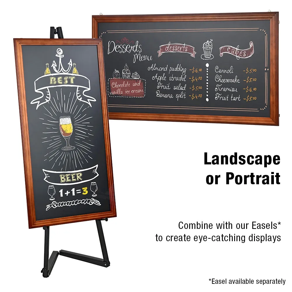 The chalkboard wall menu has a wooden frame for a classic look that will fit in well with a variety of different décors, whether used in a cafe, pub, restaurant, or retail store. The wooden framed black board features a mahogany finish, with beveled edges and etched grooves alongside the frame providing a stylish look. With the wood frame the menu display has a 1150 x 600mm and weighs 5.5kg to be easily placed onto most walls and create a focal point for visitors to look at.