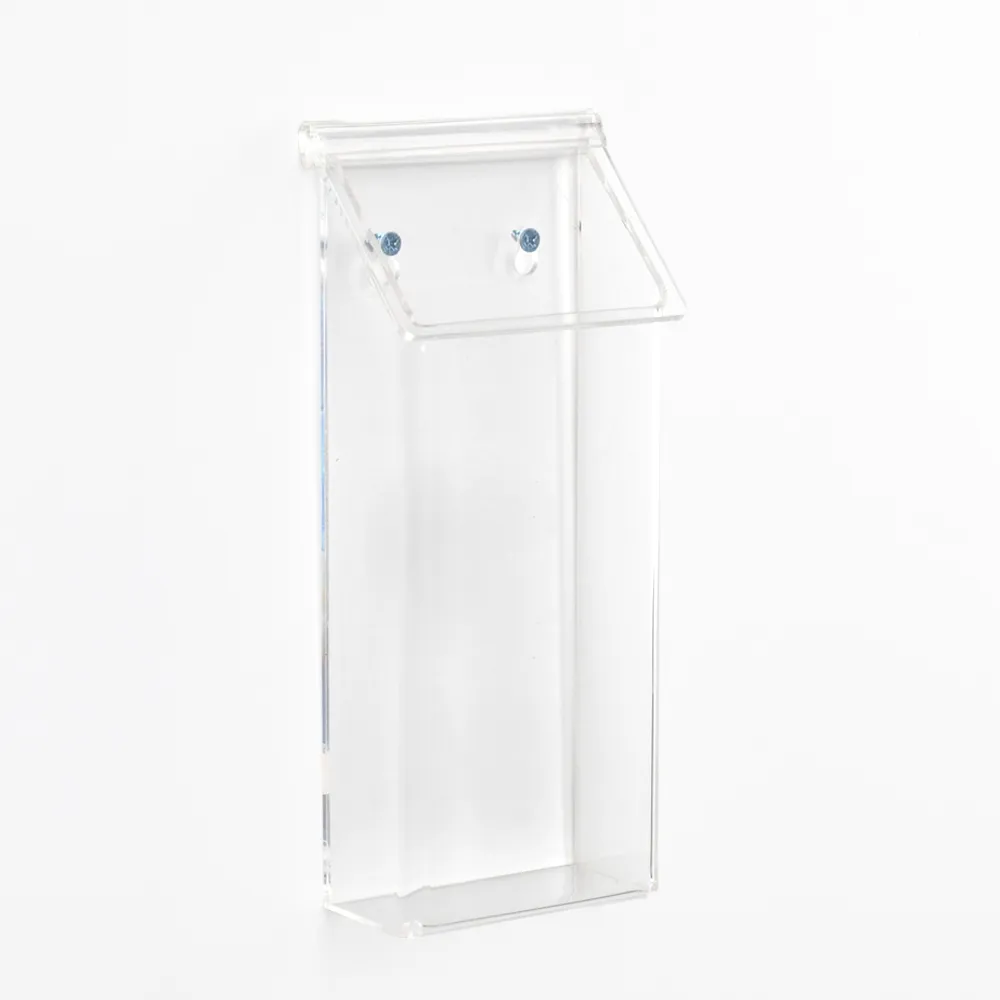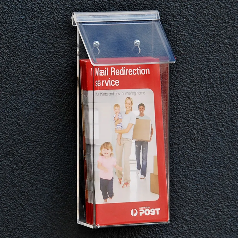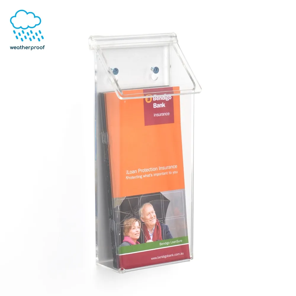 The outdoor DL brochure holder, also known as a waterproof leaflet dispenser and wall mounted literature pockets, is made from 3mm thick clear acrylic that offers a full view of pamphlets placed within as well as providing a waterproof container. The angled lid on top helps to prevent water from seeping into the sealed container and let it run down to keep the interior dry. This wall mounted display has notches in the back of the pocket as well to easily place the box onto the included screws that are protruding from the wall.