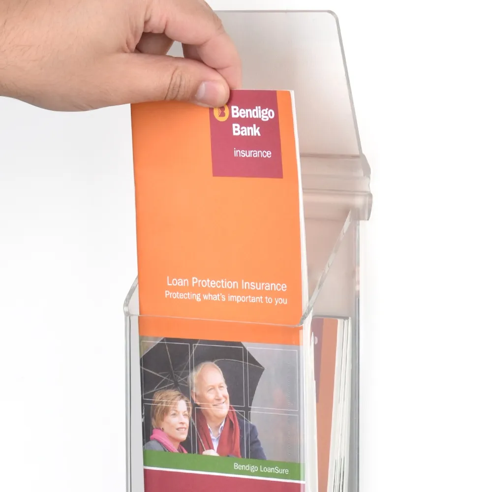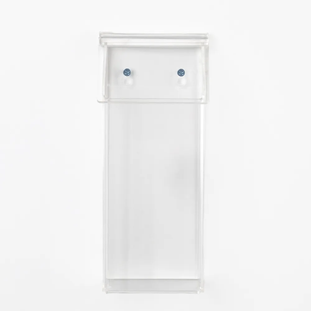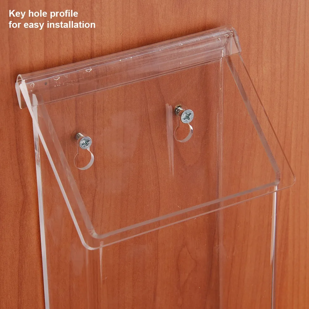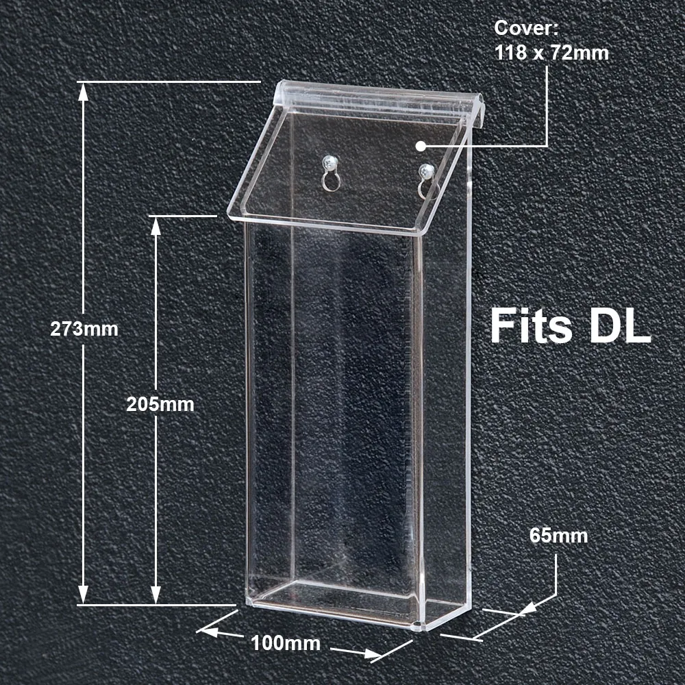 The outdoor DL brochure holder, also known as a waterproof leaflet dispenser and wall mounted literature pockets, is made from 3mm thick clear acrylic that offers a full view of pamphlets placed within as well as providing a waterproof container. The angled lid on top helps to prevent water from seeping into the sealed container and let it run down to keep the interior dry. This wall mounted display has notches in the back of the pocket as well to easily place the box onto the included screws that are protruding from the wall.