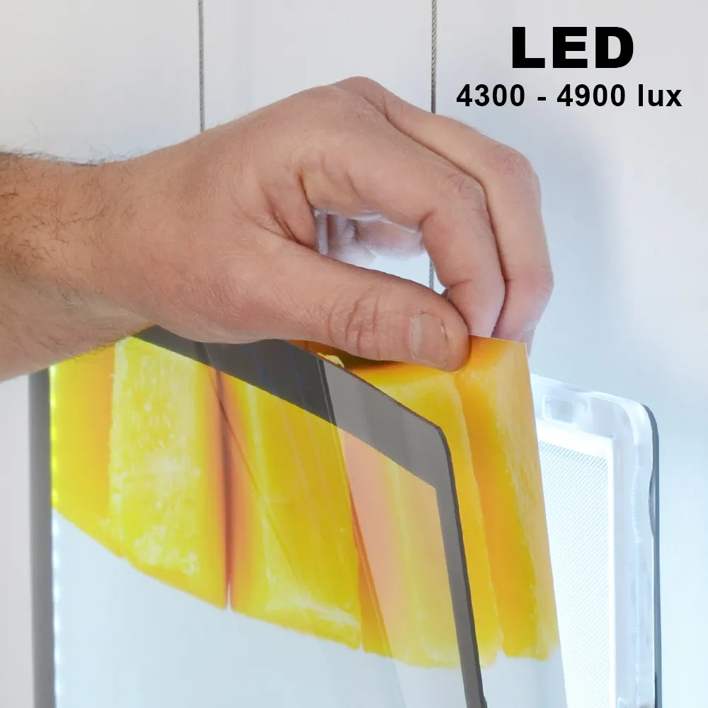 • Poster light boxes are rated 4300 – 4900 lux, with a diffusion pattern for even lighting