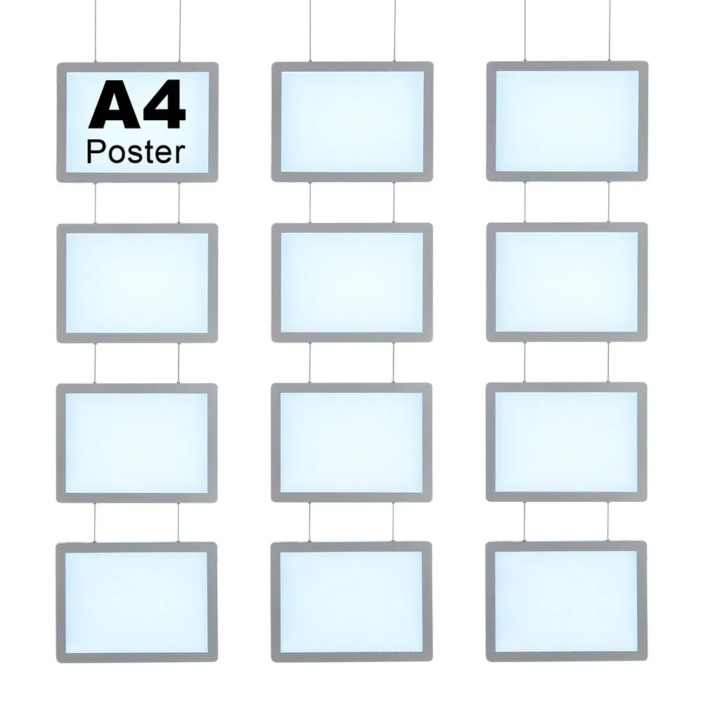 These illuminated poster displays, real estate window display signs have LEDs within each frame that light up translucent posters to both draw attention and provide visibility in storefronts at night! The 5800 – 6500 lux ratings offer bright displays that use a diffusion pattern to evenly distribute light and prevent hot spots. All of these light boxes include a 2-year warranty to offer peace of mind with purchase. The poster holders are arranged in 3 columns, with 75mm joiners attaching between the frames. There are (6) 3m long cables that attach to the uppermost poster frames and can be cut to size to fit the length that you need. Power is supplied via these cables as well to maintain a professional appearance without unsightly power cables protruding from each frame.