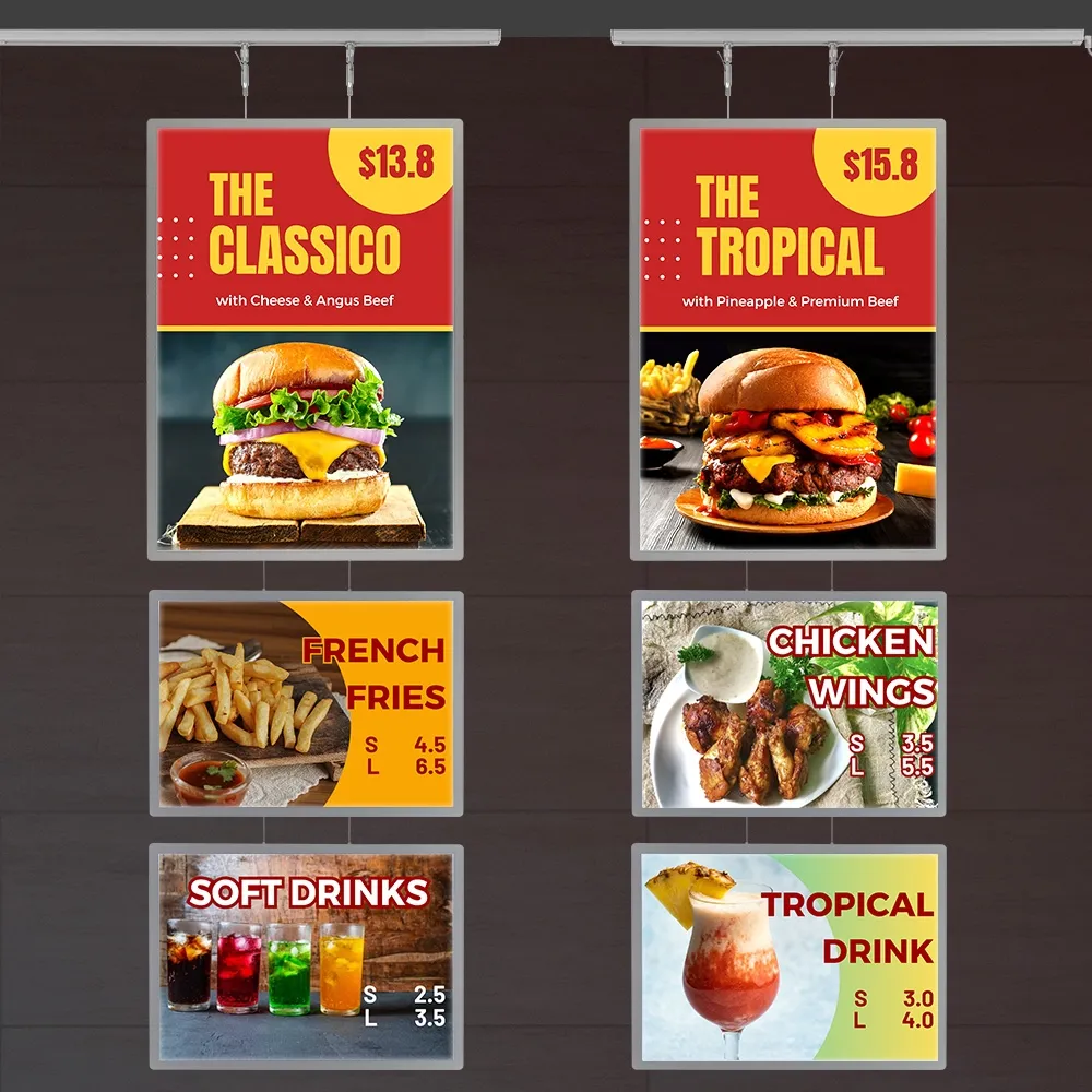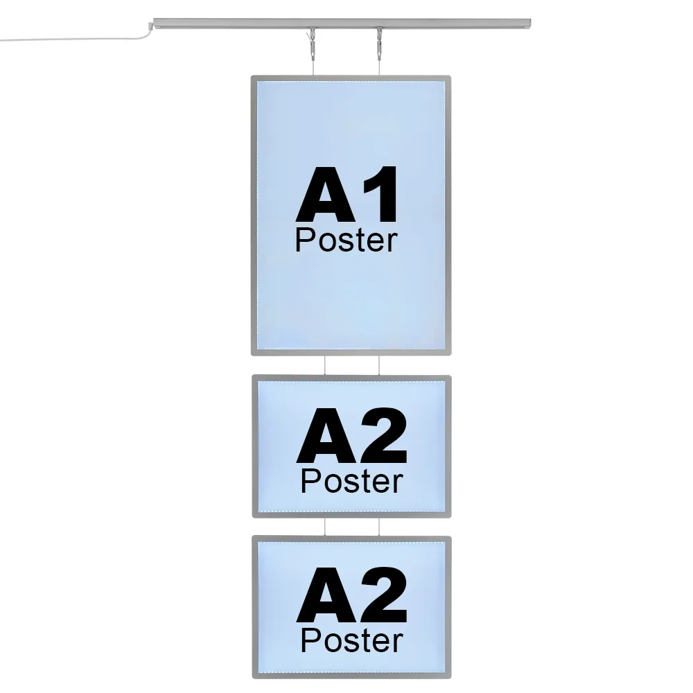 This illuminated poster holder, real estate LED window is typically used in retail stores, shopping centres, exhibition halls, information centres, museums, and more to draw in passersby using lit up signs. Each frame is rated for 3000 – 3500 lux and has a diffusion pattern that evenly distributes the light to ensure posters are lit properly. The hanging rail powers the signage via the included cables, with each clearly labeled as positive or negative for connections to pre-drilled holes on the poster frames. These 3m cables can be cut to size to fit the length you need, and the slide system on the rail makes it easy to position the hanging signs as needed.