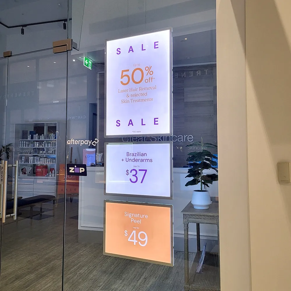 This real estate LED window uses multiple poster frames to make advertising to passersby and clientele simple. The hanging lightboxes include (2) sizes of posters frames, with an A1 (594 x 841mm) and A2 (420 x 594mm) lightbox frame used in this kit. Both lightboxes feature a versatile design that can be hung in either landscape or portrait orientation depending on your need. There is a silver bordered front face on each side that is magnetic to make switching out the signage quick and easy with no tools necessary. A display with posters on both sides is perfect for placement in storefront windows to advertise inside and outside of your business at the same time. A 2-year warranty is included with each lightbox to provide peace of mind with your purchase.