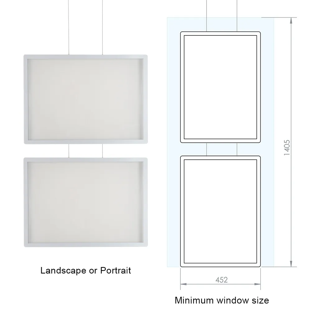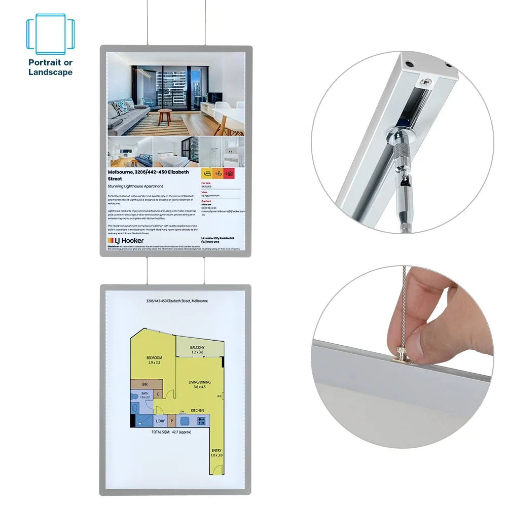 These hanging lightboxes, backlit real estate signs feature embedded LEDs that offer 3000 to 3500 lux of brightness. A diffusion pattern within each frame distributes the light to help prevent hot spots and ensure translucent posters are evenly lit. To suspend the frame from the ceiling, there are two 3m long cables that can be cut to length to fit nearly any size ceiling space. A set of 75mm joiners connect the top frame to the bottom frame, with all cables made of stainless steel and providing power to the frames to maintain a tidy appearance that is free of unsightly power cables.