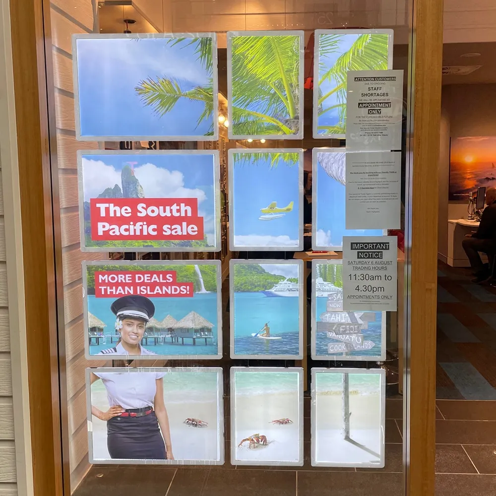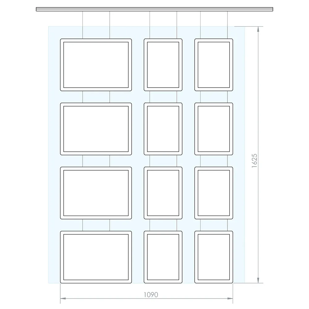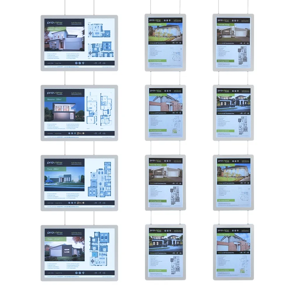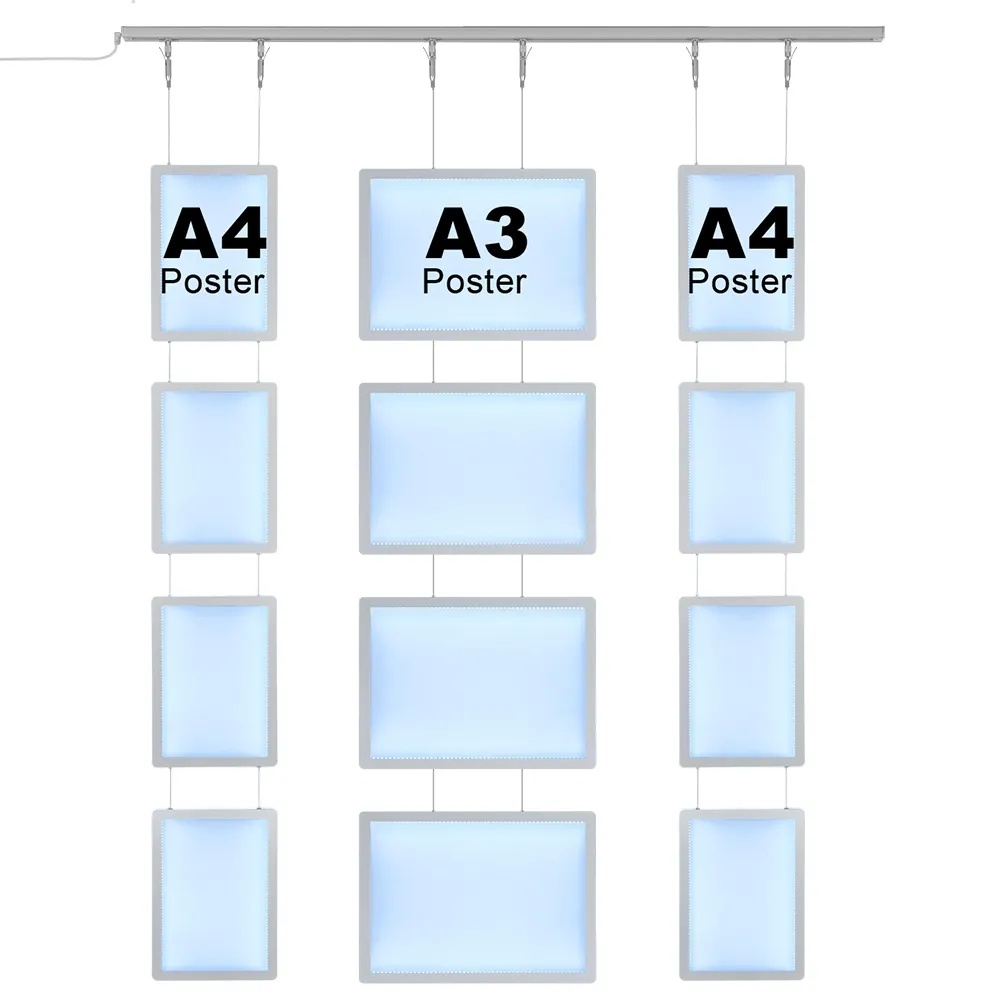These hanging light boxes, illuminated real estate signs use embedded LED lights to light up translucent posters to better get the attention of passersby. The A3 frames are rated 4300 – 4900 lux and the A4 are 5800 – 6500 lux to offer great brightness without using heaps of electricity. A diffusion pattern ensures that there are no hot spots and light is distributed evenly. This kit is arranged into (3) columns, with the top frames connecting to the ceiling rail via 3m long cables that can be cut to necessary length. All other poster holders are joined together using 75mm long cables to ensure uniformity. The cables are made of stainless steel for durability and to provide power directly to the frames without the need for additional power cables to maintain a tidy appearance.