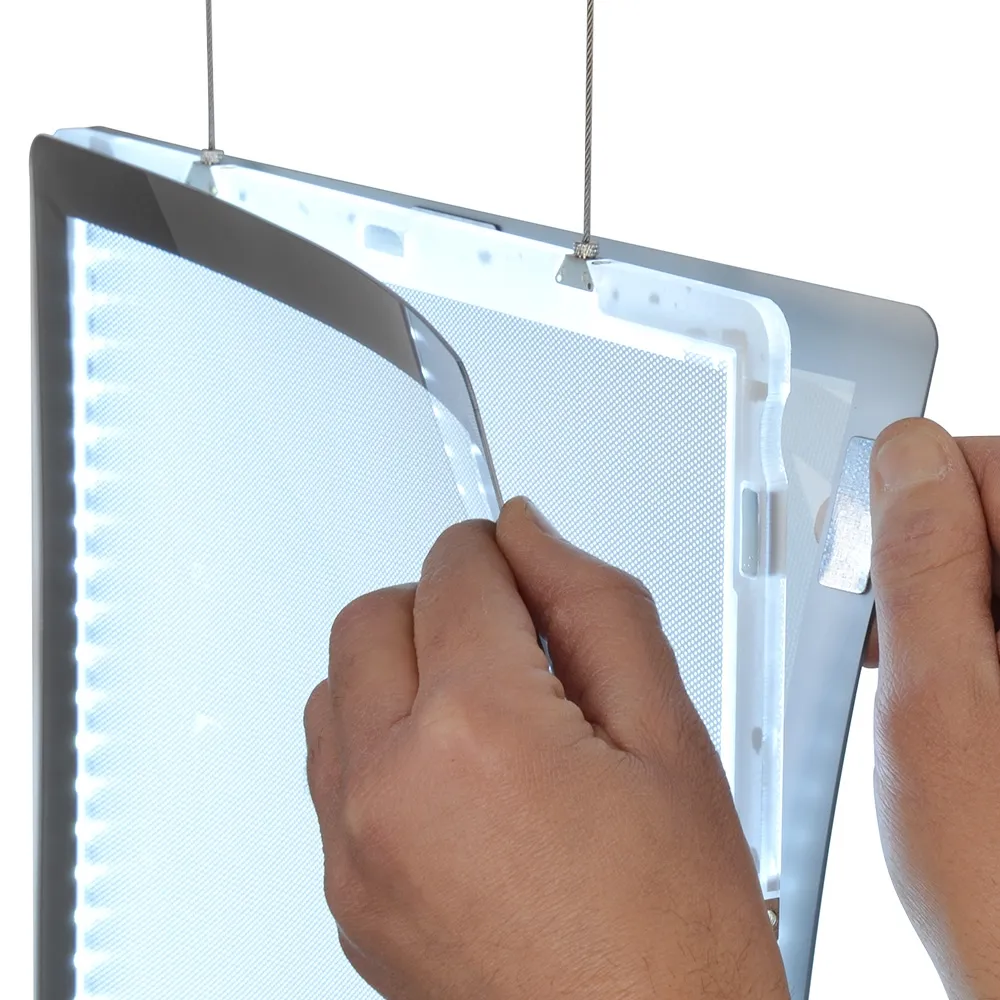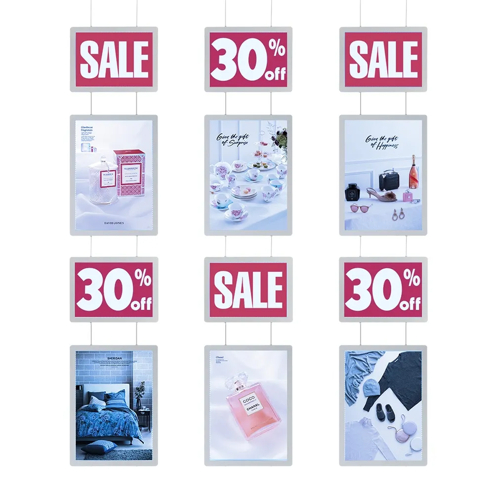 LED window display signs, like other illuminated hanging poster holders, use a diffusion pattern to evenly light translucent posters and prevent hot spots on displayed items. The bright poster light boxes have a 4300 – 4900 lux rating for the A3 frames and 5800 – 6500 for the A4 poster holders. Using illuminated signage allows for use after hours, as the units are visible to passersby outside your location when placed in storefront windows. The uppermost holders attach to the ceiling via 3m long cables that can be cut to needed length. The lower poster holders are hung using 75mm joiner cables that ensure even spacing. All cables are made from stainless steel and supply power in addition to holding the frames to offer a professional look.