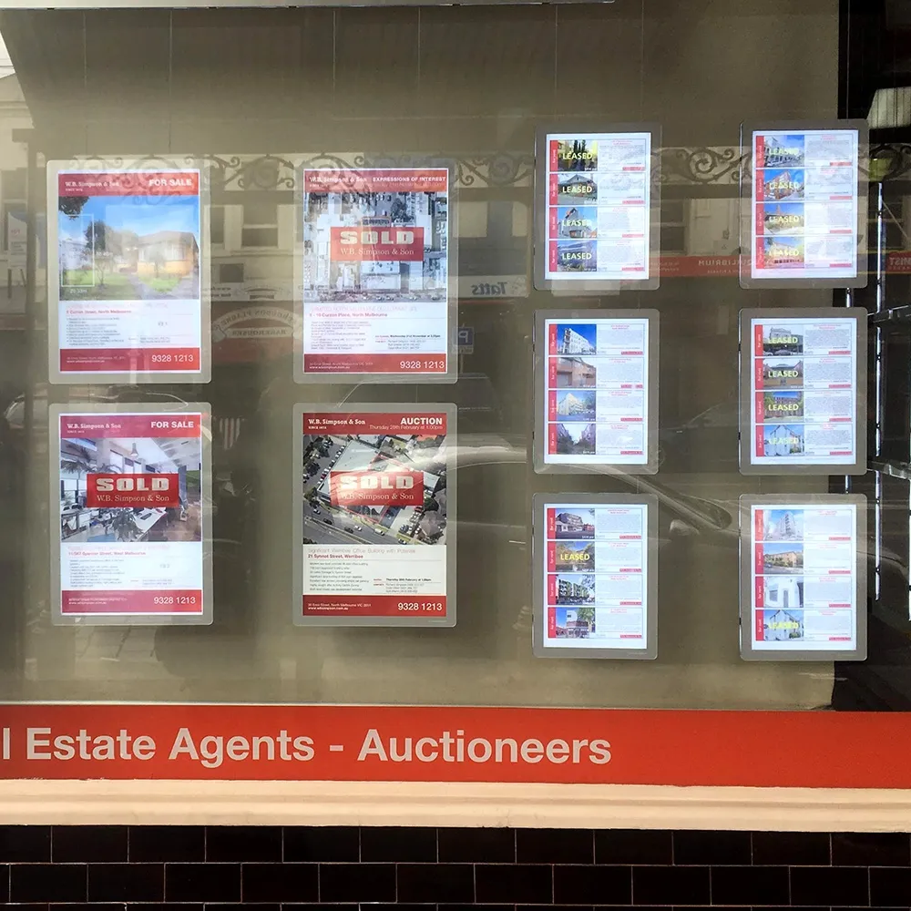 These LED window display signs create a large grid with different sizes of posters to make an eye-catching display that advertises to passersby in style! There are (12) poster frames included with this kit that are all dual-sided to display a total of (24) individual posters, making it easy to showcase various properties, products, travel destinations, available packages, and more. There are six A3 (420 x 297mm) and (6) A4 (297 x 210mm) frames in this set, all able to be hung in portrait or landscape orientation depending on your needs. A 2-year warranty is provided to offer peace of mind with your purchase and ensure you receive quality workmanship. The front faces of the holders have silver bordered and use magnets to tightly secure graphics in place. No tools are needed to quickly change out graphics as well!