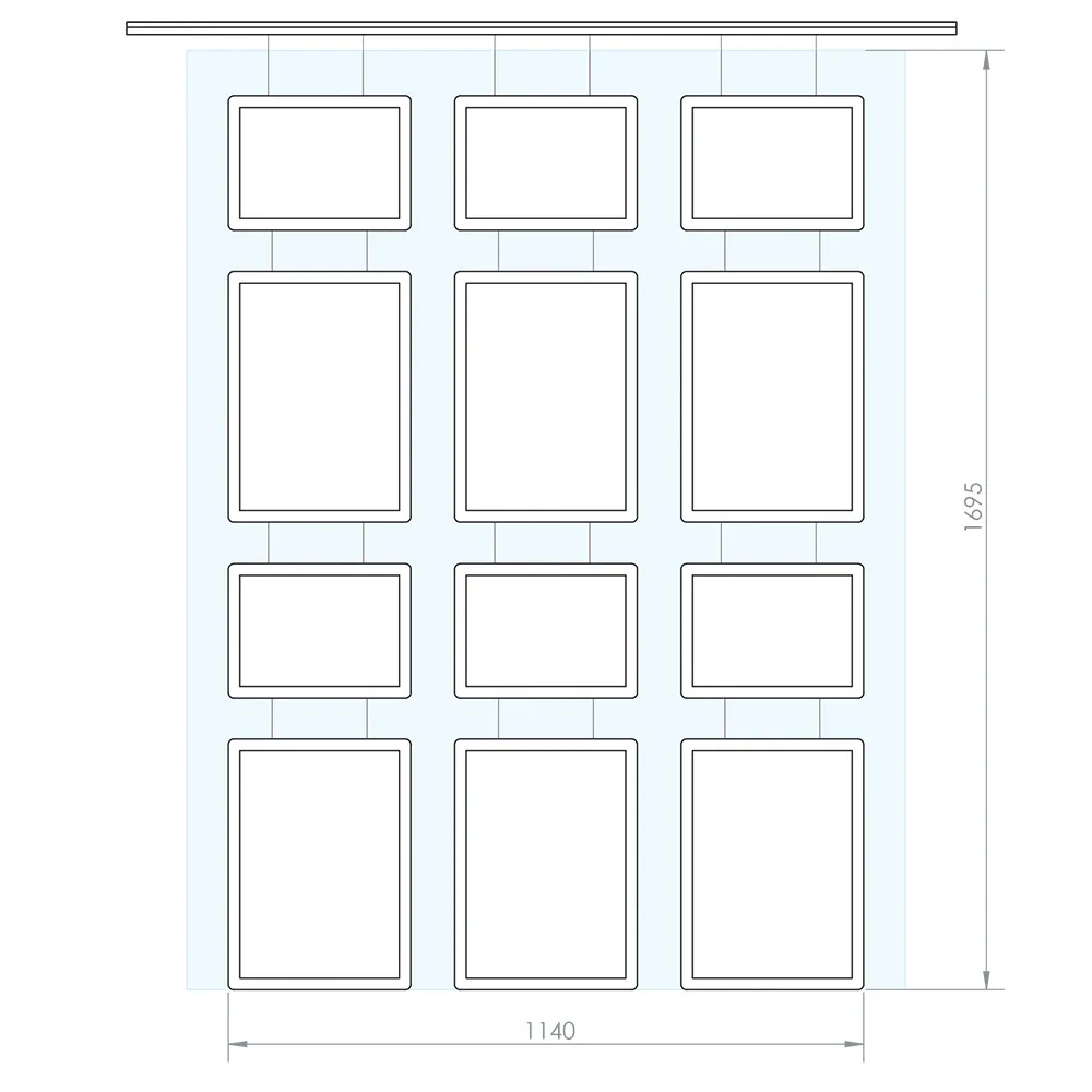 - Frames hang using adjustable wire from rail on ceiling that also supplies power to light boxes