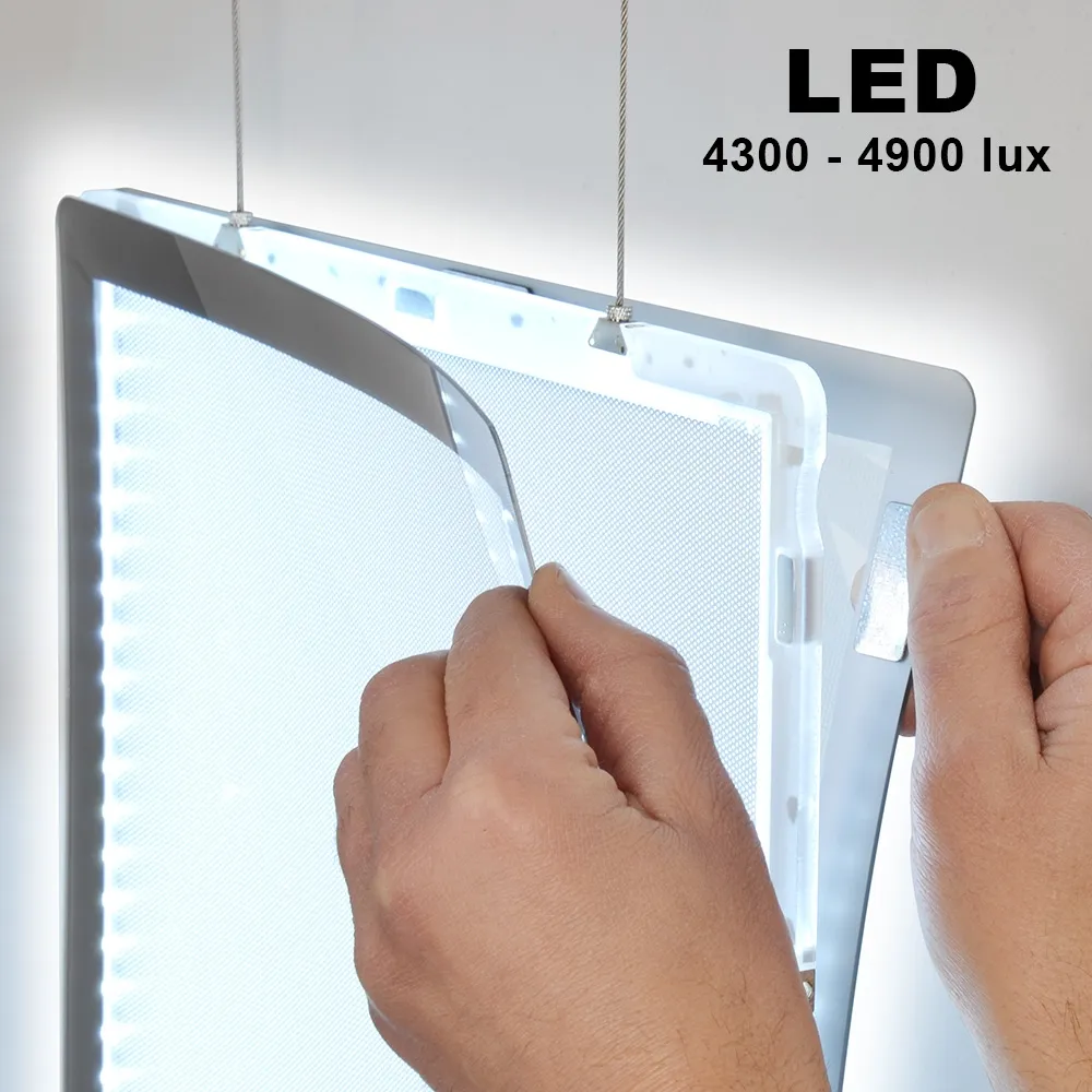 The LED window display, like suspended light box frames, has LEDs within that are rated 4300 – 4900 lux to brightly illuminate translucent posters. A diffusion pattern helps evenly distribute light to avoid hot spots. There are (4) cables that are 3m long and can be cut to size to attach the top poster frames where needed. Sets of 75mm joiners connect the lower frames to the upper ones. Both the joiners and cables are made from stainless steel and provide power to the poster holders as well as hold them in place for a professional looking fixture that improves the marketing of any location.