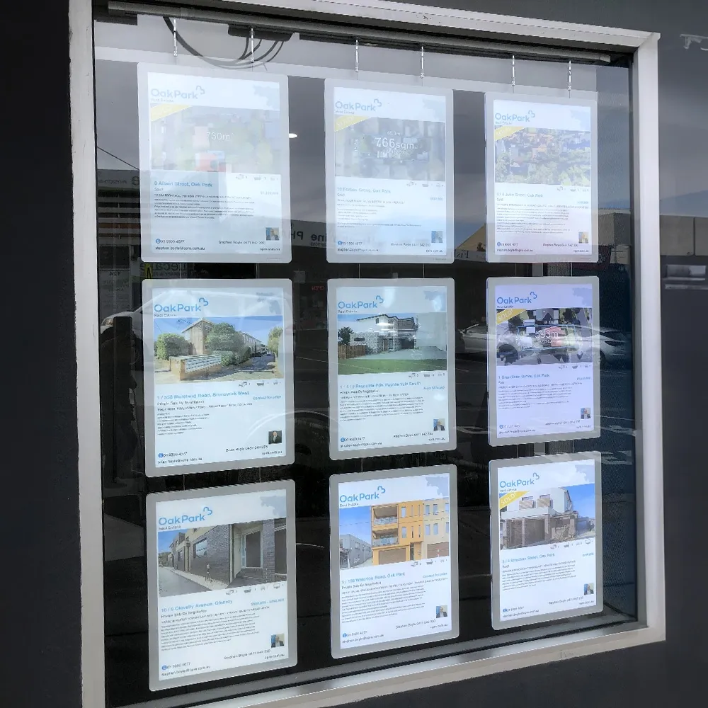 These illuminated lightbox signs are used in retail stores, real estate agencies, shopping centres, travel agencies, and more to have a large array of information posters on display in a single spot! There are (9) poster frames included that display A3 (420 x 297mm) posters in portrait or landscape format depending on your need, as there are pre-drilled spots on both sides for cable attachment. The dual-sided design of the frames offers visibility in multiple directions at once whilst maximising space, ideal for use in storefront windows to promote inside and outside at the same time. The front face of each frame has a silver bordered lens that attaches with magnets to make graphic changes easy whilst tightly holding posters in place.