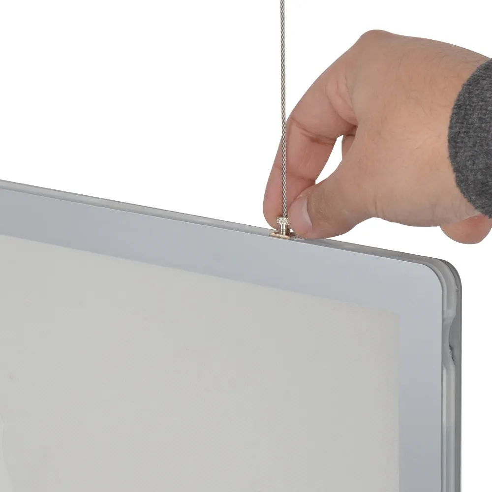 Illuminated lightbox signs, like hanging real estate displays, use bright LEDs to light up translucent posters to better get the attention of passersby. The 4300 – 4900 lux rating provides bright displays that use a diffusion pattern to avoid hot spots and evenly light graphics. These displays each come with a 2-year warranty as well to provide peace of mind with purchases and ensure long-lasting use. 75mm long joiners are used to connect the lower poster frames together, with (6) 3m long cables that can be cut to needed length attaching the uppermost displays to the celiing rail. These stainless steel cables not only suspend the signage, but also provide power to maintain a professional look.