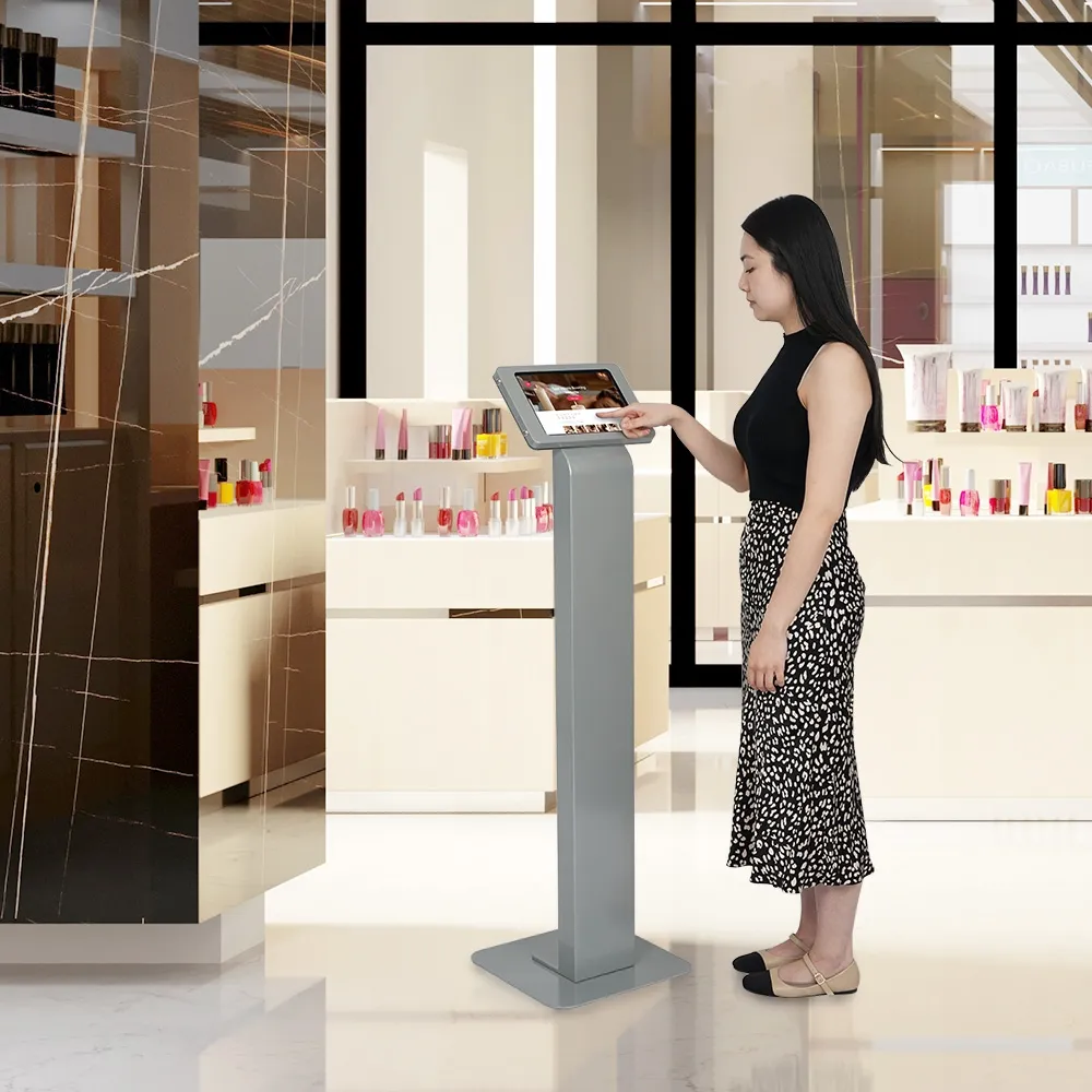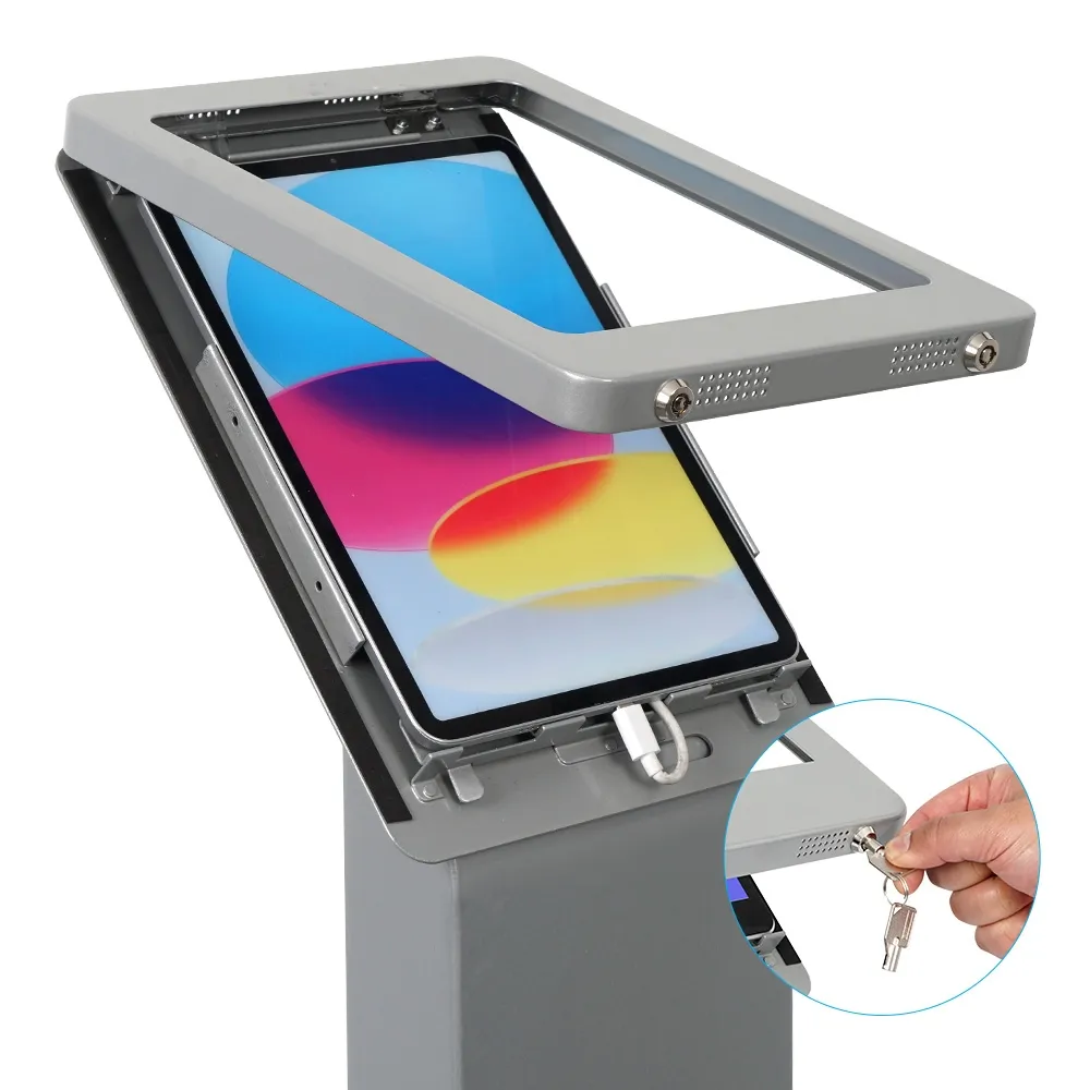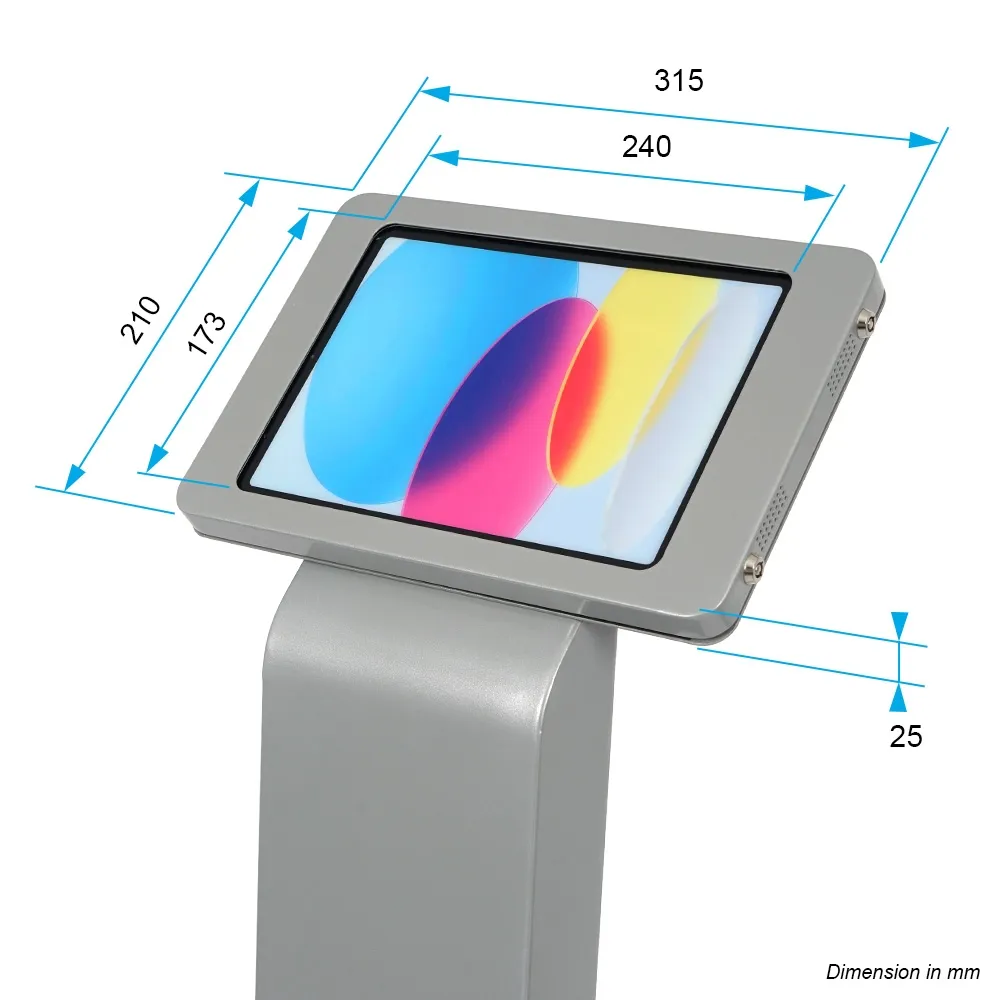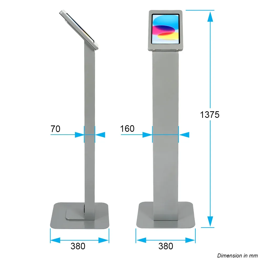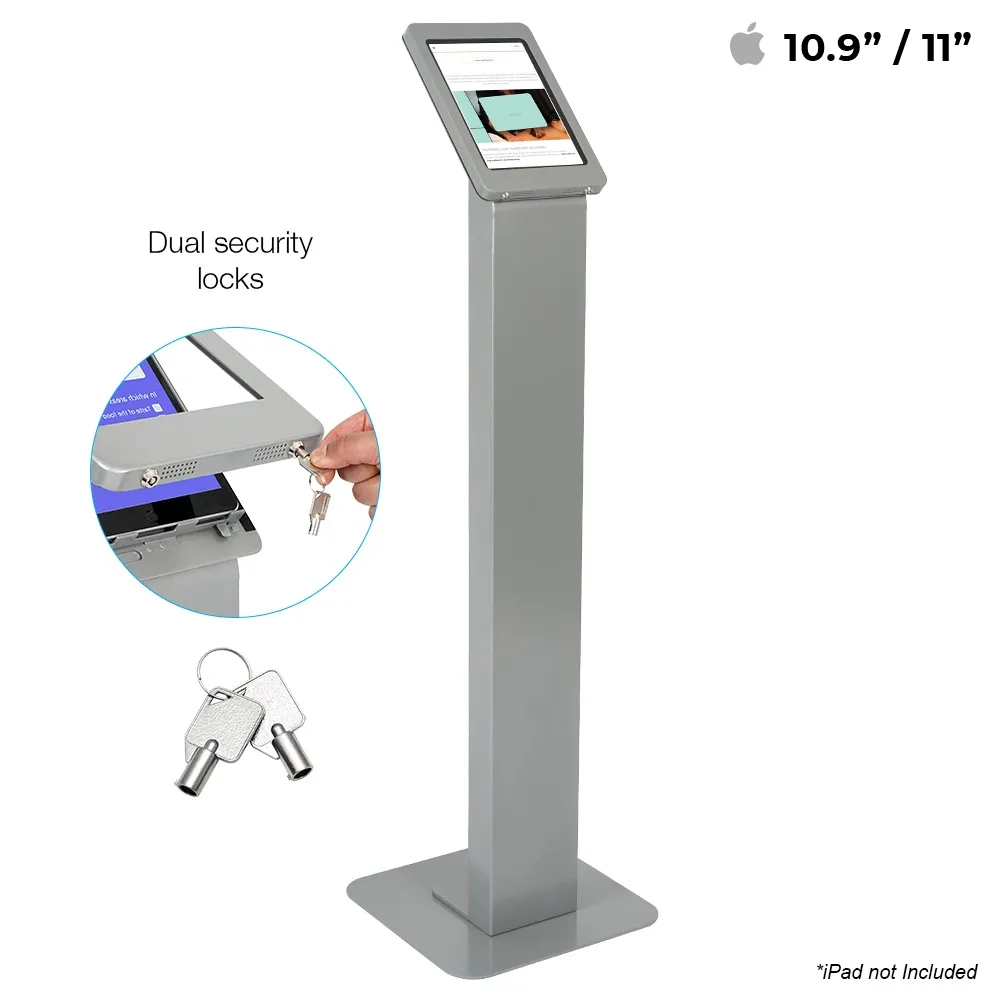 This iPad 11 ichn stand is designed for compatible Apple® iPad Pro, iPad, and iPad Air models listed above. The versatile mount for the unit is able to be placed in either portrait or landscape orientation to fit the needs of your business. The home button on the device is covered to prevent full access to the tablet and keep users on the app you have pre-loaded. There are air holes on two sides of the display to help prevent overheating and allow the speakers to be heard. This display is great for use in retail stores, information centres, exhibition halls, car dealerships, restaurants, and more.