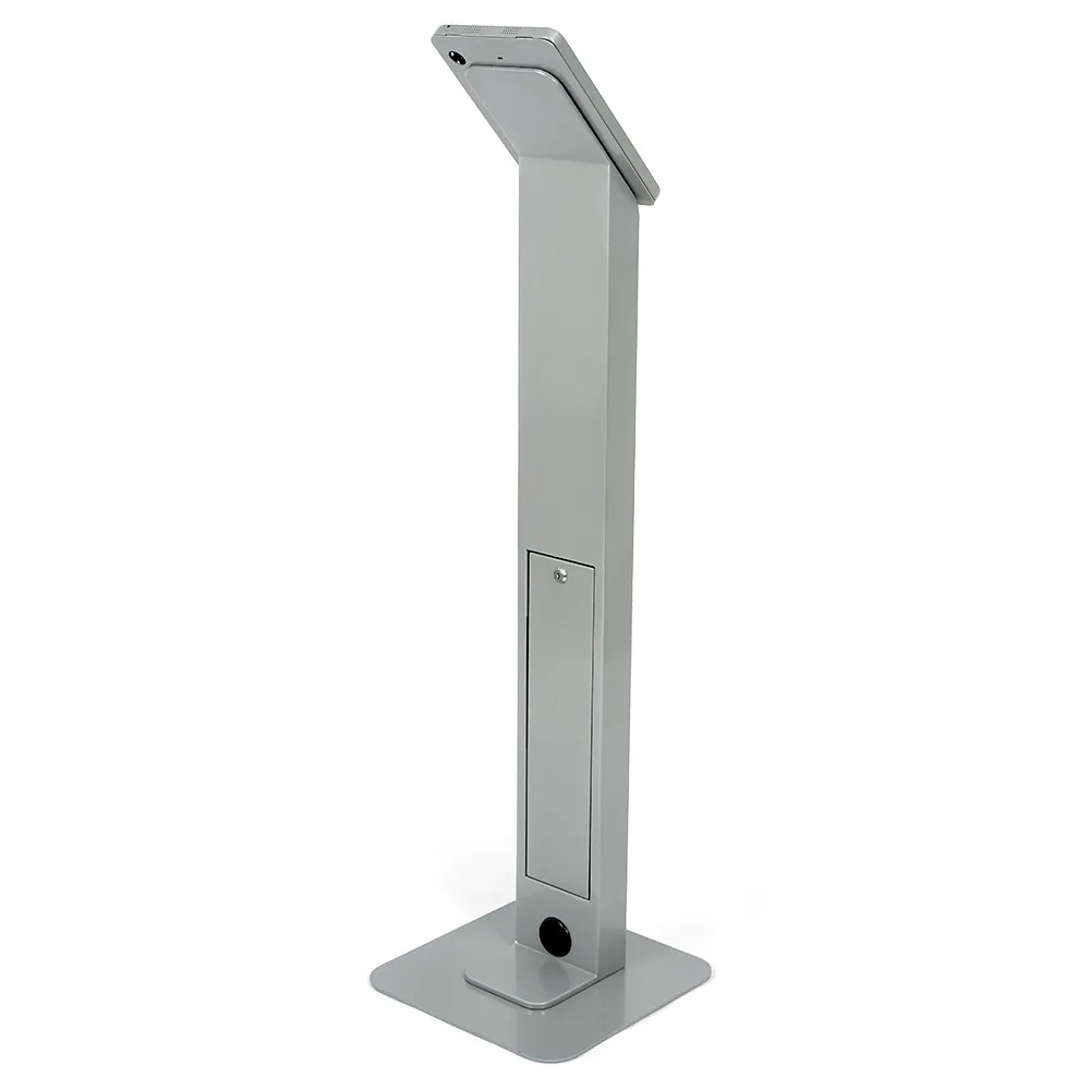The iPad 11 inch stand, part of our line of secure tablet displays, features a locking design to allow for use in public spaces with little worry of theft. The centre column includes a storage space, accessible via a locking door on the rear of the cabinet. Internal cable management threads the power cord from your tablet through the centre column to maintain a tidy look, with the cable going through a hole and rubber gasket on the bottom of the display. The tablet is mounted on an angle to allow easy use by all patrons. The 1375mm tall display is perfect for users of different heights to interact with the tablet at your location.