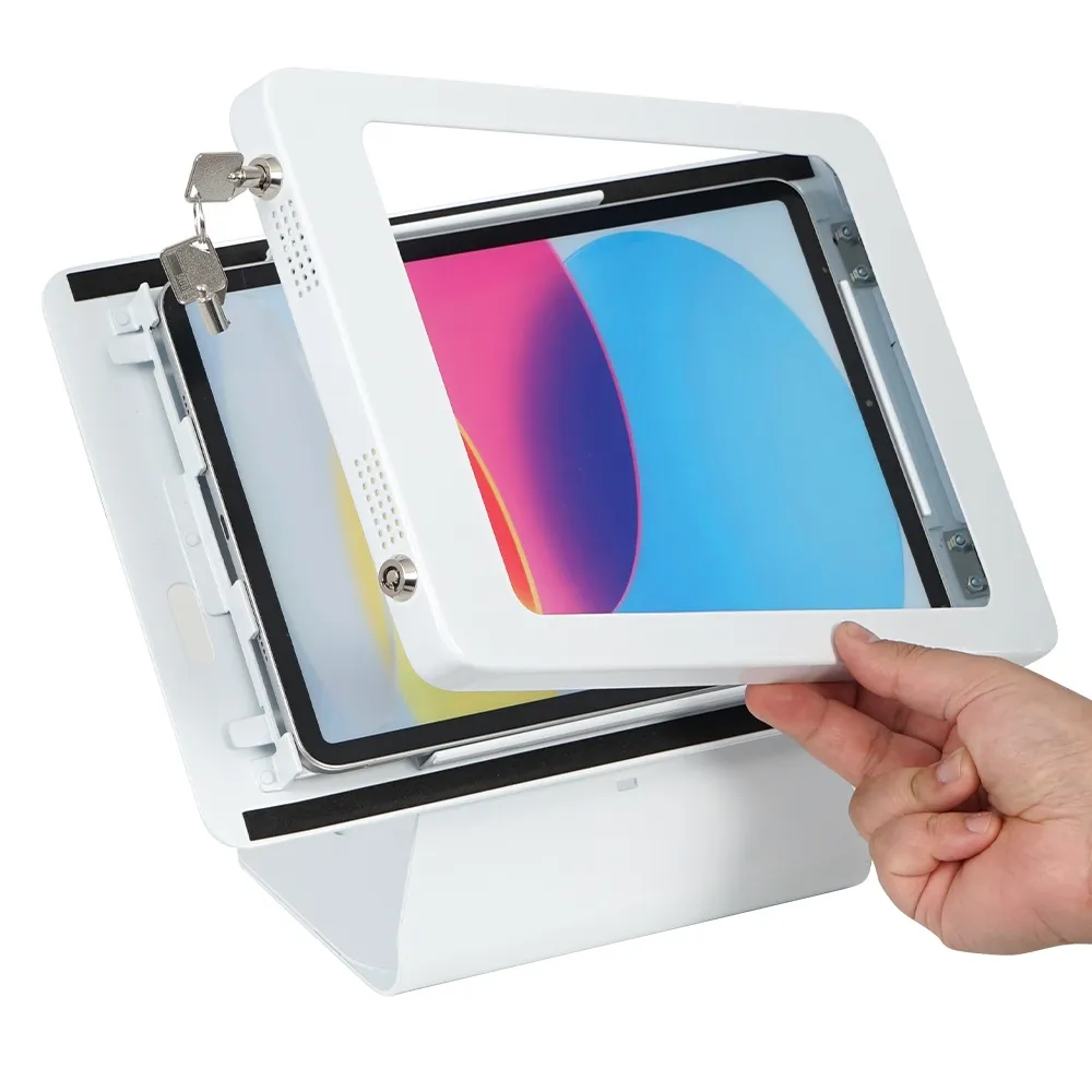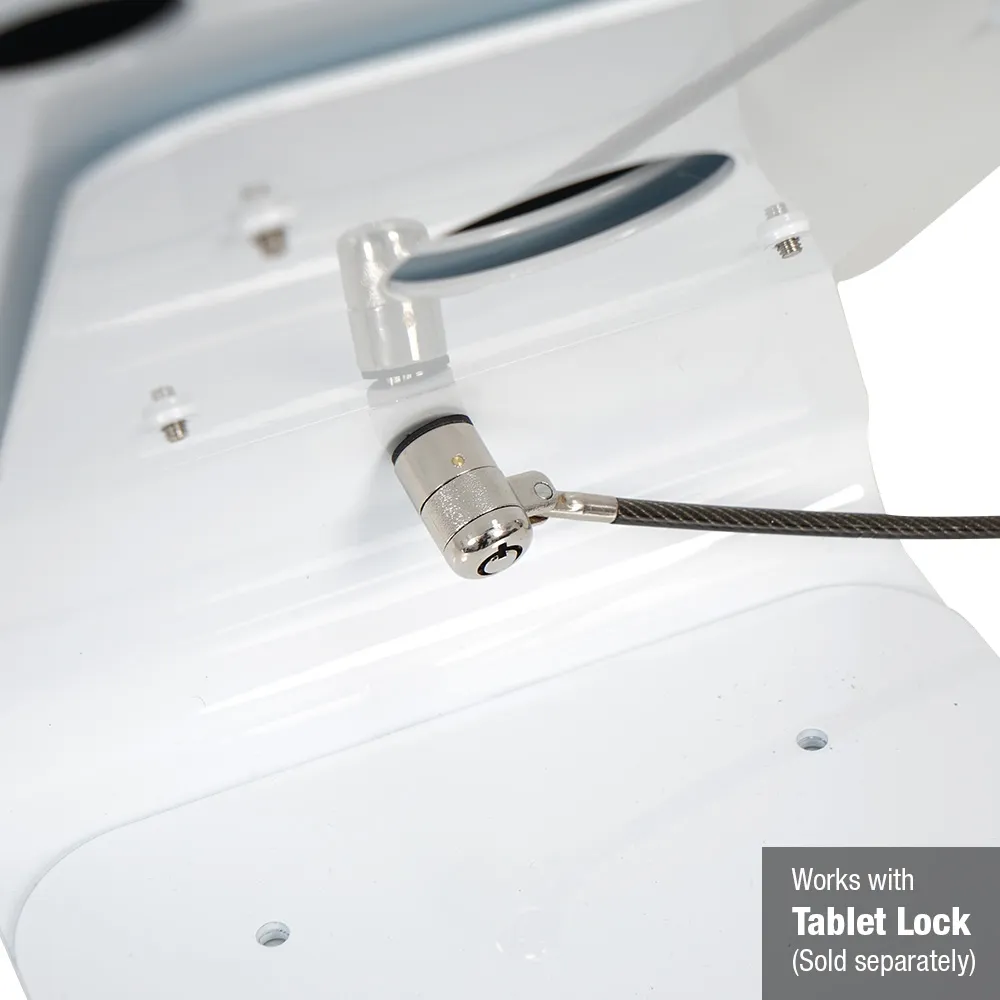 The secure tablet wall mount, like other lockable iPad displays, features dual locks on one side of the mount to keep the display safe while and use in public areas. A Kensington lock slot on the mount allows for an additional security measure, with the cable lock (sold separately) able to attach the entire display to a secured fixture. The home button on the unit is covered to prevent full access to the device to disallow visitors from changing any of the settings.