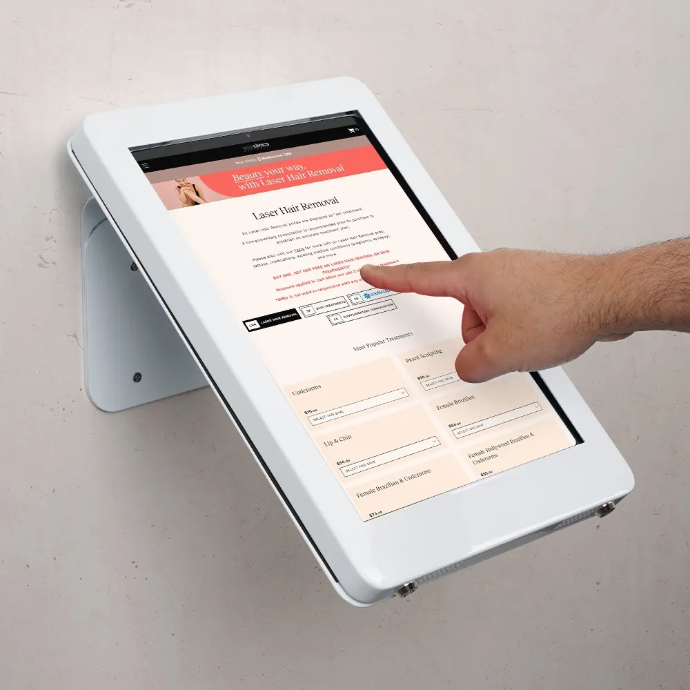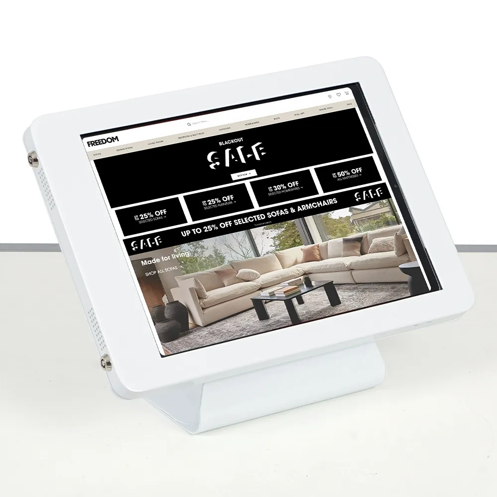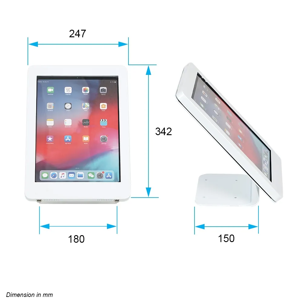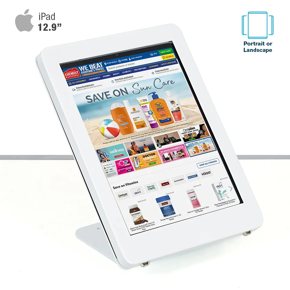 - iPad Pro 12.9 POS stand installs in landscape on walls & portrait or landscape on counters
