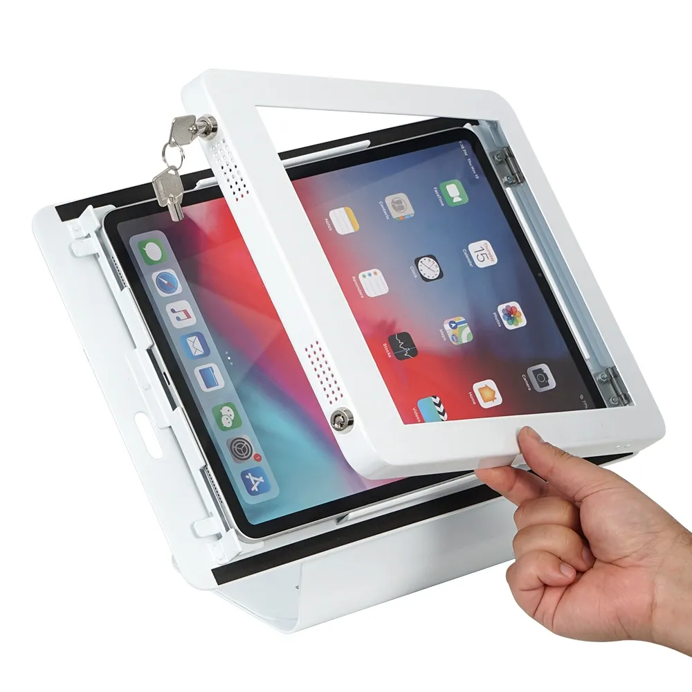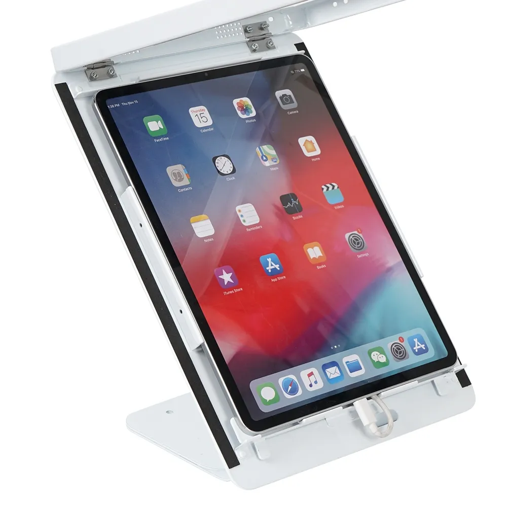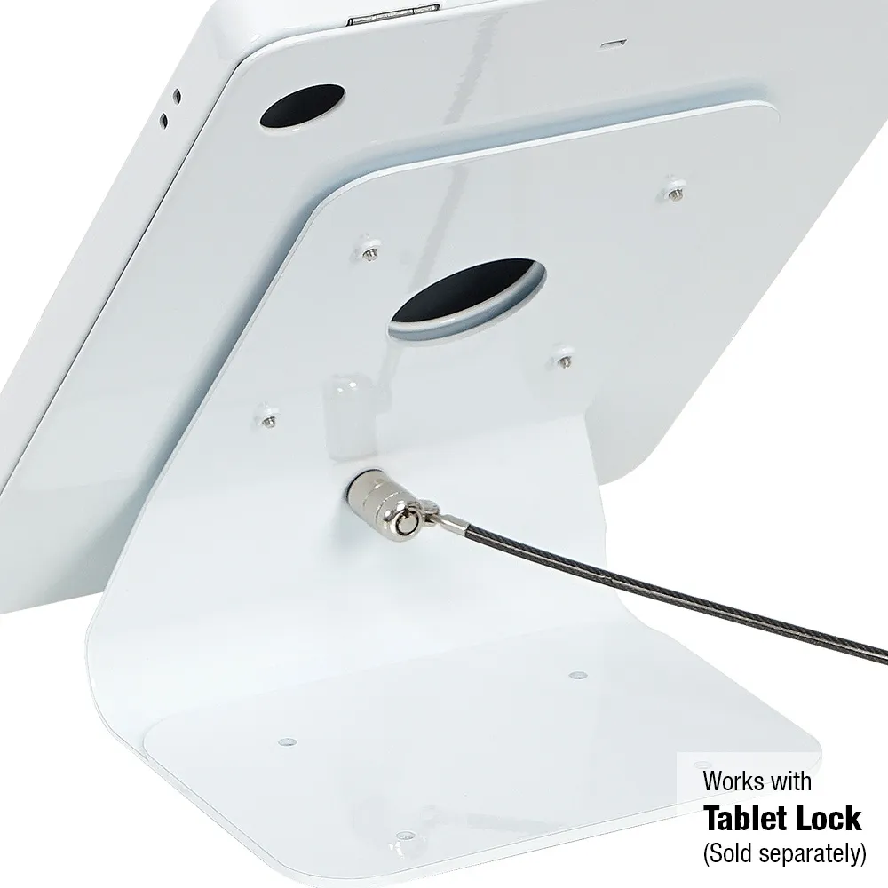 This iPad 12.9 POS stand, like other lockable displays, has security in mind by having dual locks on the display to help prevent theft while placed in public areas. For additional security, there is a Kensington lock slot that allows a cable lock (sold separately) to attach the entire display to a secure fixture. There are vents on either side of the locks to promote air flow and prevent overheating whilst also allowing audio to be used if in use at your location.
