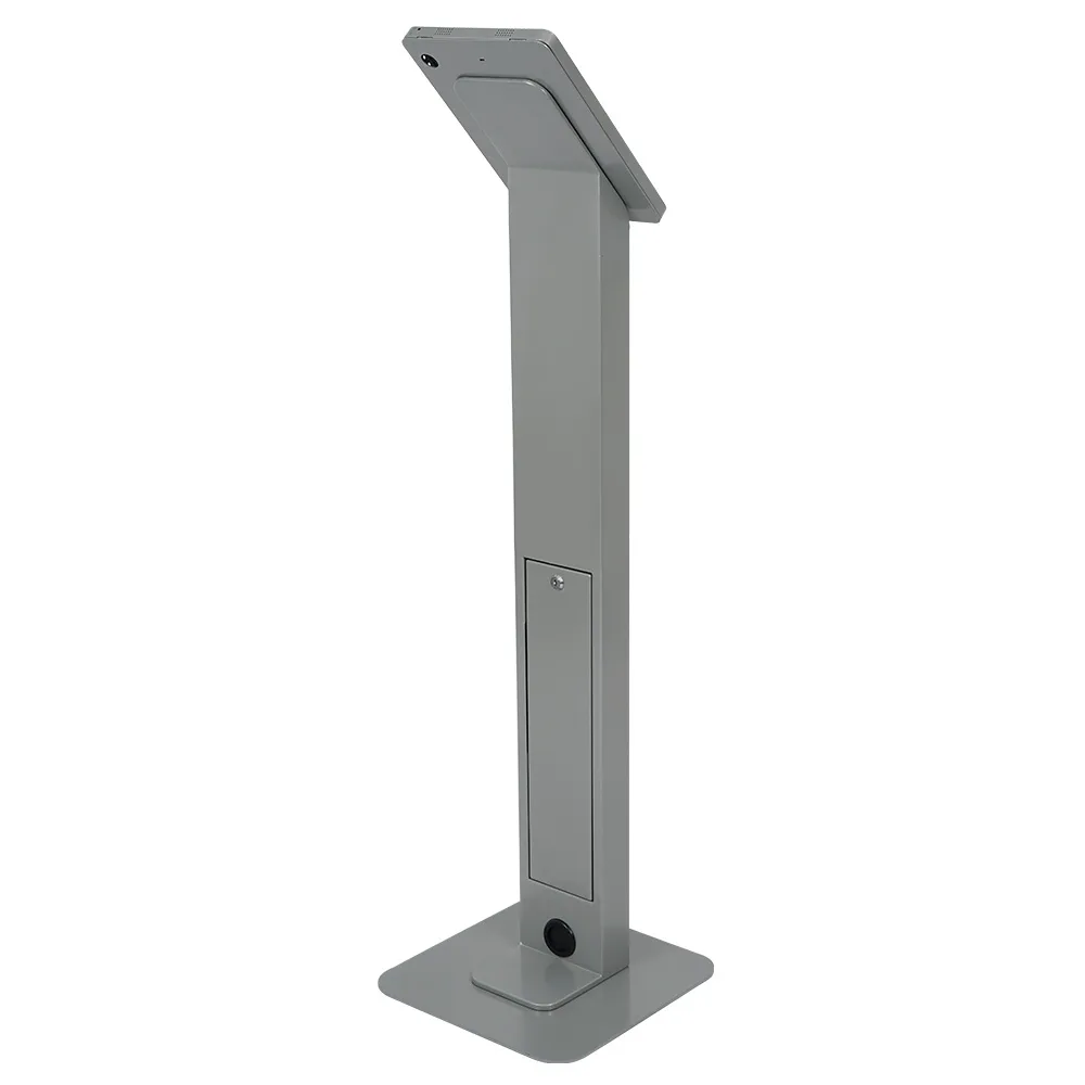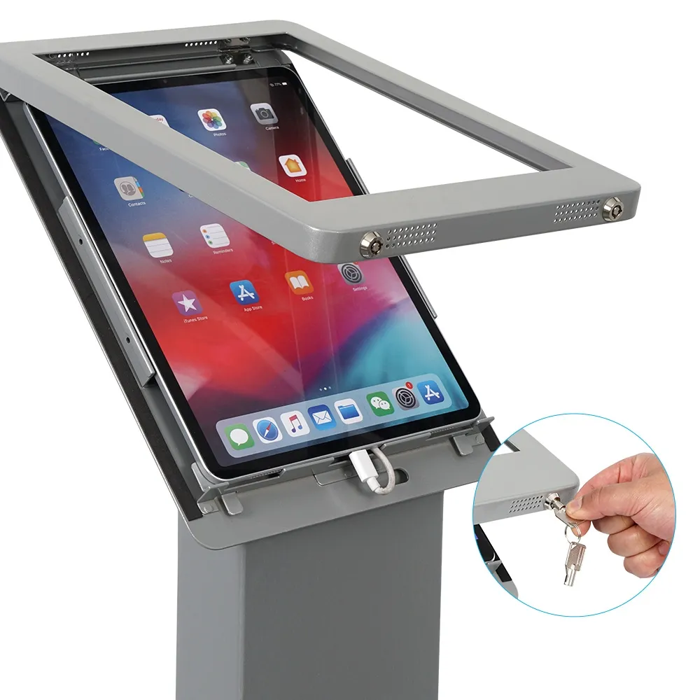 This iPad 12.9 in stand, part of my line of freestanding tablet holders, features dual locks on the mount in order to help prevent theft. This allows the stand to be used in public areas without having to be constantly watched. The rear of the unit includes a removable locking cabinet door that offers interior access for storage of smaller items. Your power cable for the tablet is hidden within the centre column to maintain a professional look, and is accessed by a small hole in rubber gasket on the back rear of the unit.