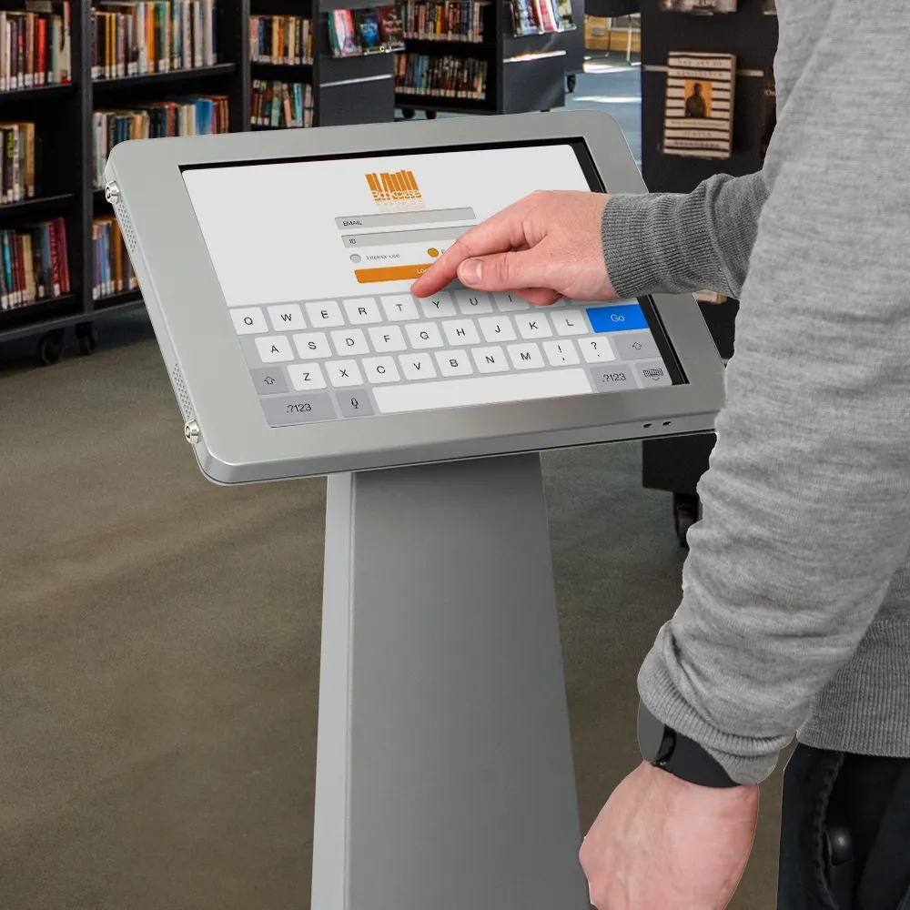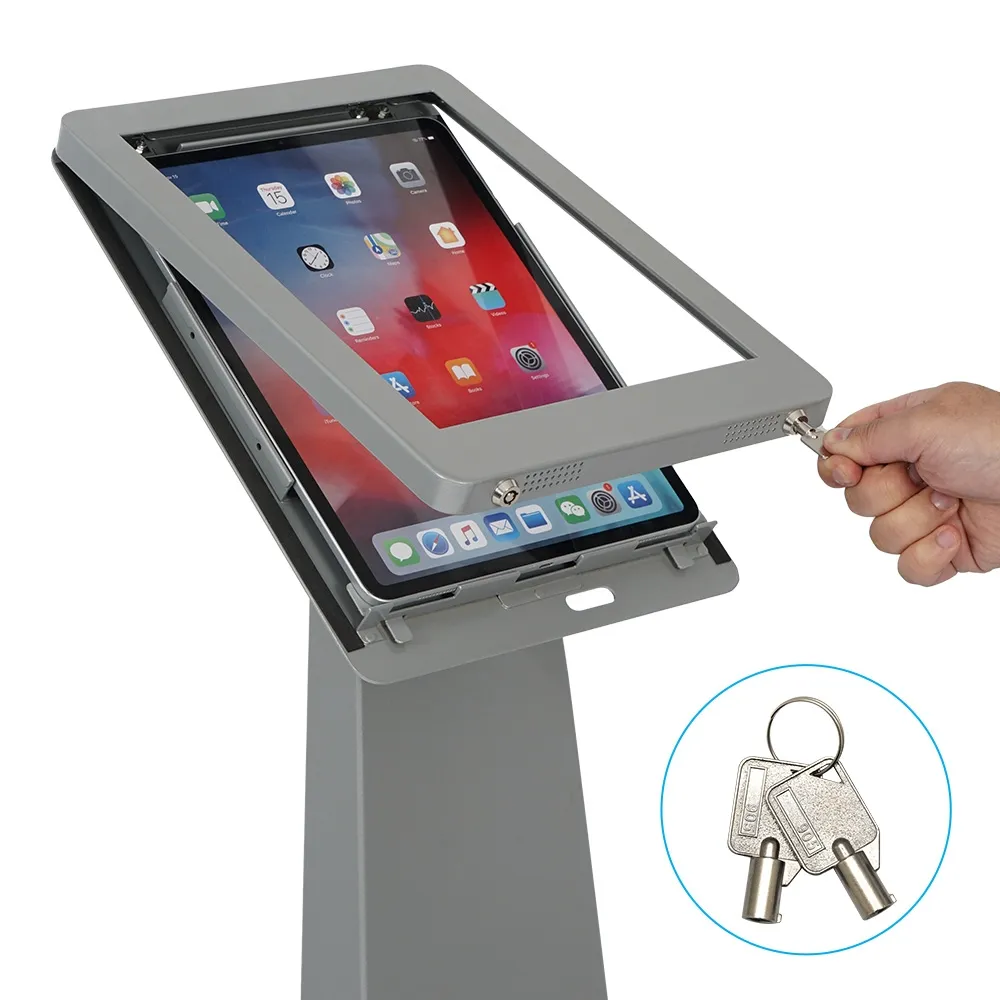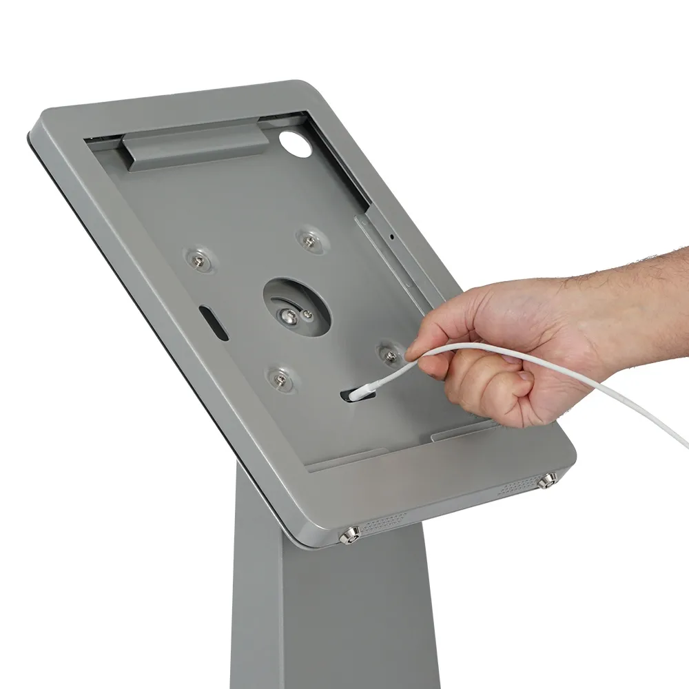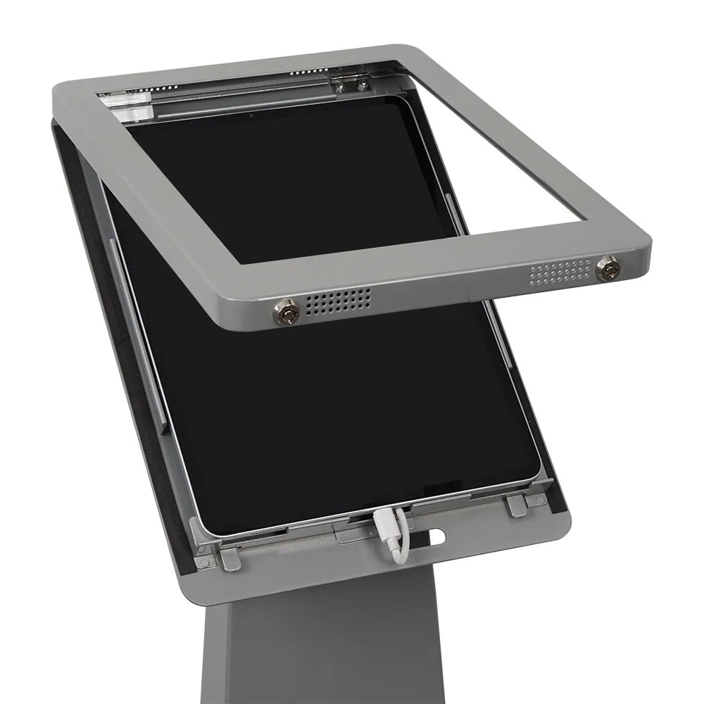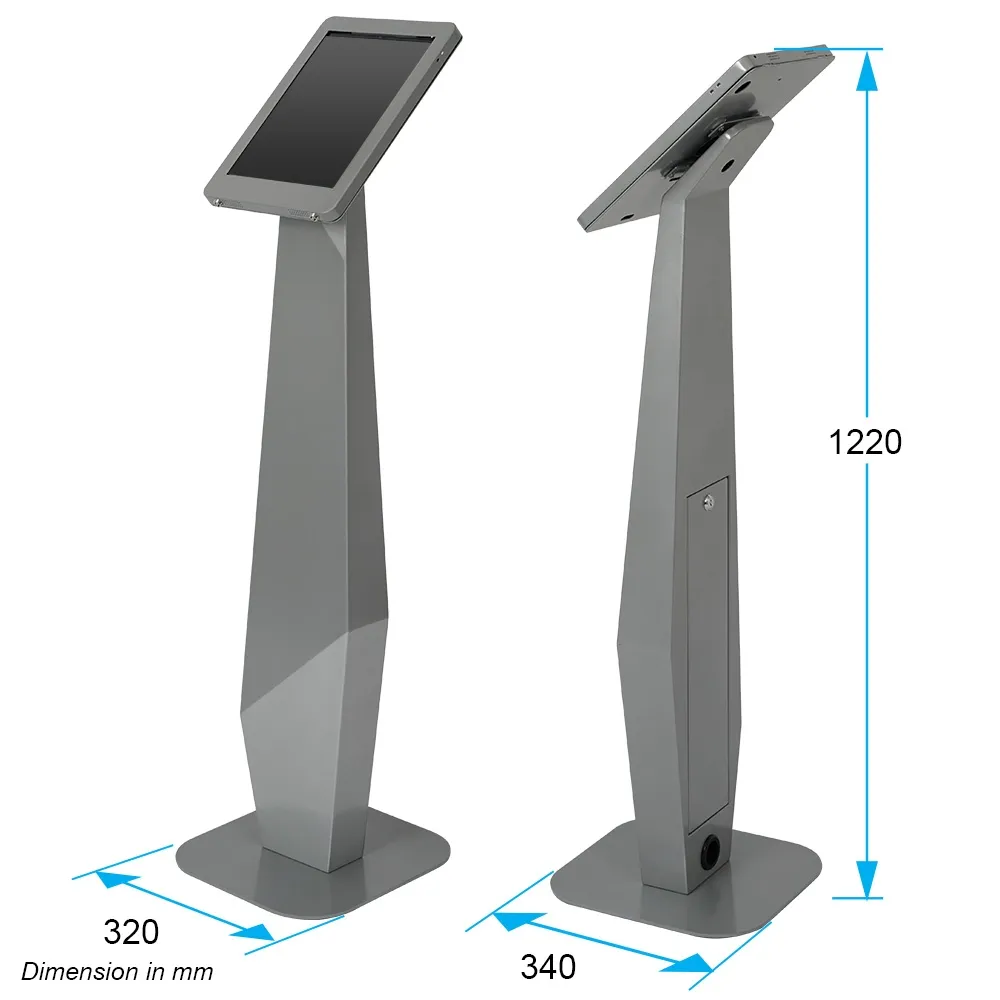 The stand for iPad Pro 12.9, like other floor standing tablet displays, is a secure fixture with a lockable mount to help prevent theft when in use in public areas. The centre column has a 180 x 570 x 60mm storage space inside, accessible via a locking panel on the rear of the unit. This stand is 1200mm tall to be used by patrons of different heights without issue.