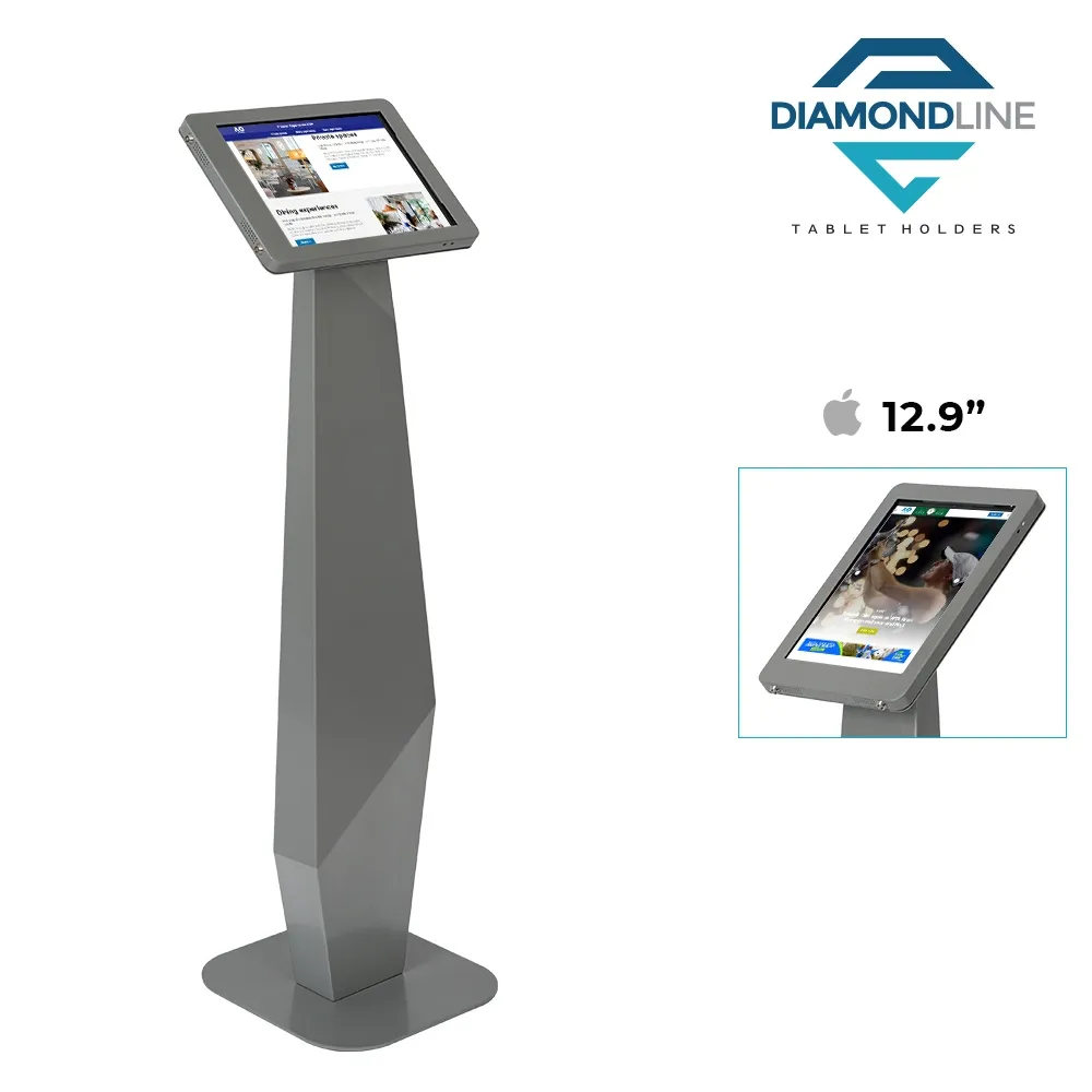 This stand for iPad Pro 12.9 / 13" is part of our Diamond Line range of premium tablet holders, featuring robust builds and stylish looks at a price affordable on any budget. The freestanding tablet display is designed to hold Apple® iPad Pro 12.9” 3rd, 4th, 5th & 6th generation, iPad Pro 13" (2024, 2025) & iPad Air 13" (2024, 2025) in in either portrait or landscape format depending on your need. The camera is exposed on the front of the device to allow facial recognition as well as create interactive experience. The home button is covered to prevent full access to the device and keep users on the App that you have loaded onto the screen.